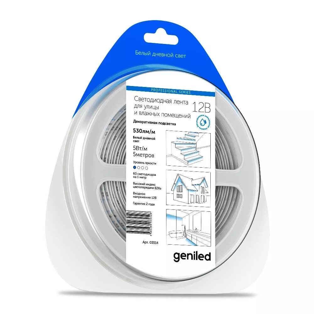 СохранитьСветодиодная лента, подсветка Geniled - для комнаты, в гардероб, на кухню, на улицу, в ванную - Белый Нейтральный свет / GL-60SMD2835 / 530 Лм/м / 12В / Длина - 5м / B - 8 мм / W - 5 вт / 4200 К / IP65 интересное: