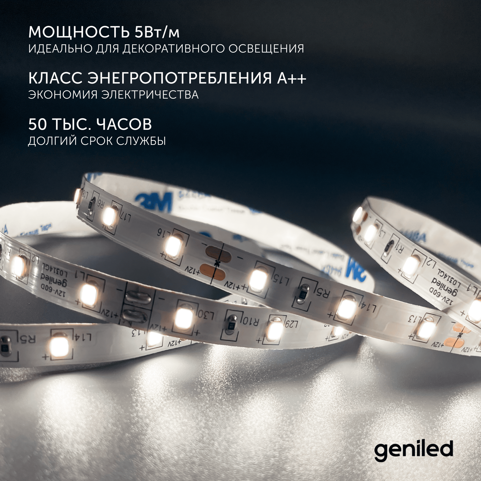 Светодиодная лента, подсветка Geniled - для комнаты, в гардероб, на кухню - Белый Нейтральный свет / GL-60SMD2835 / 650 Лм/м / 12В / длина - 5м / B - 8 мм / W - 5 вт / 3800 К / IP33