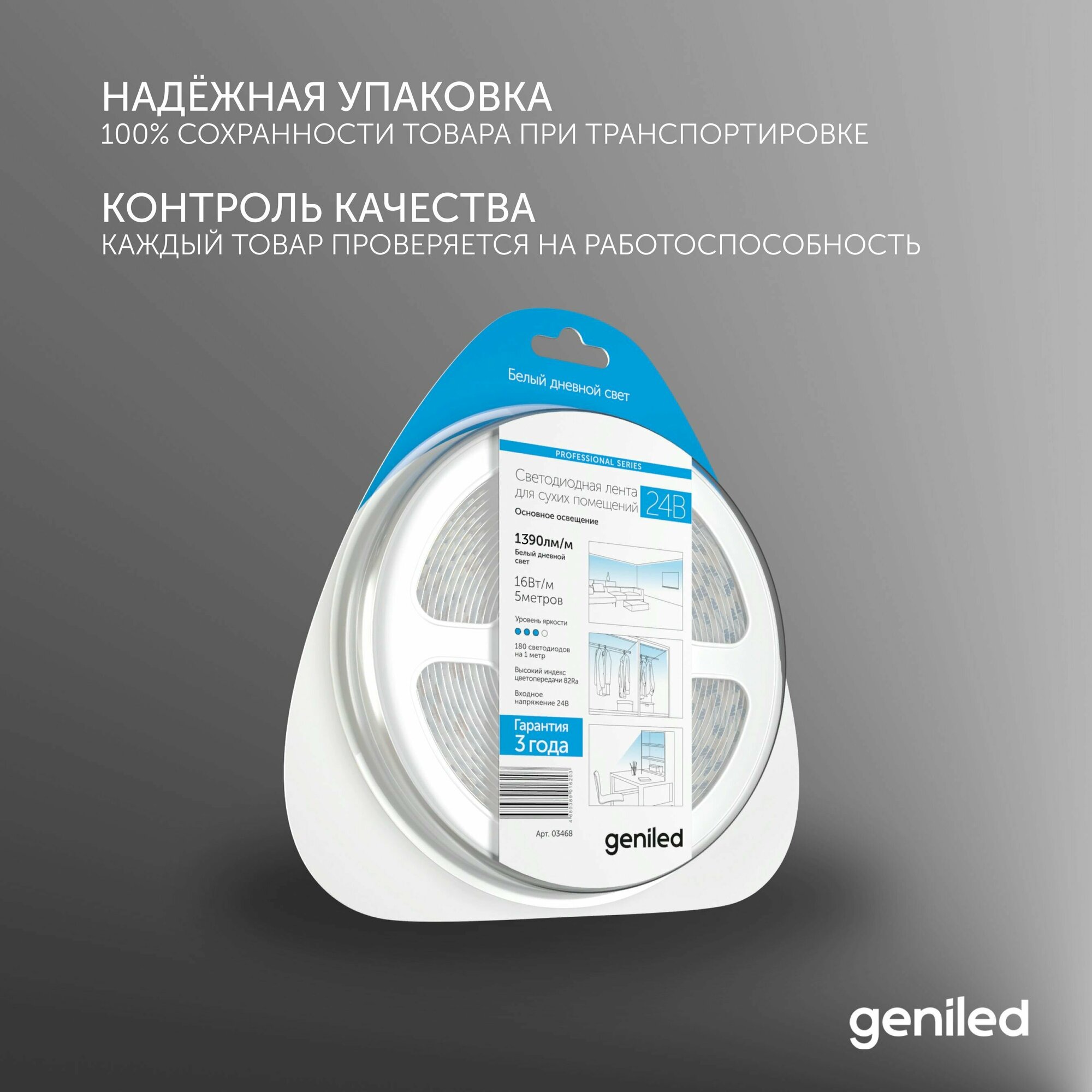 Светодиодная лента 5м 24В 16Вт/м 4000К IP65 нейтральная дневная подсветка влагостойкая уличная 180 led/m Geniled