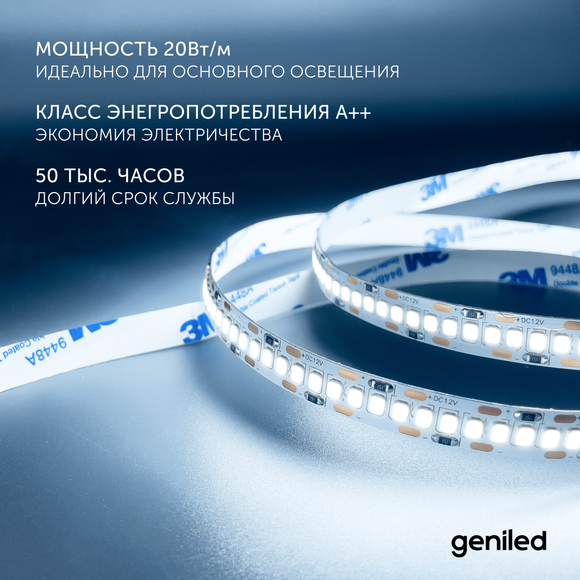 Светодиодная лента, подсветка Geniled - для комнаты, в гардероб, на кухню - Белый Нейтральный свет / GL-240SMD2835 / 2040 Лм/м / 12В / длина - 5м / B - 10 мм / W - 20 вт / 4200 К / IP33
