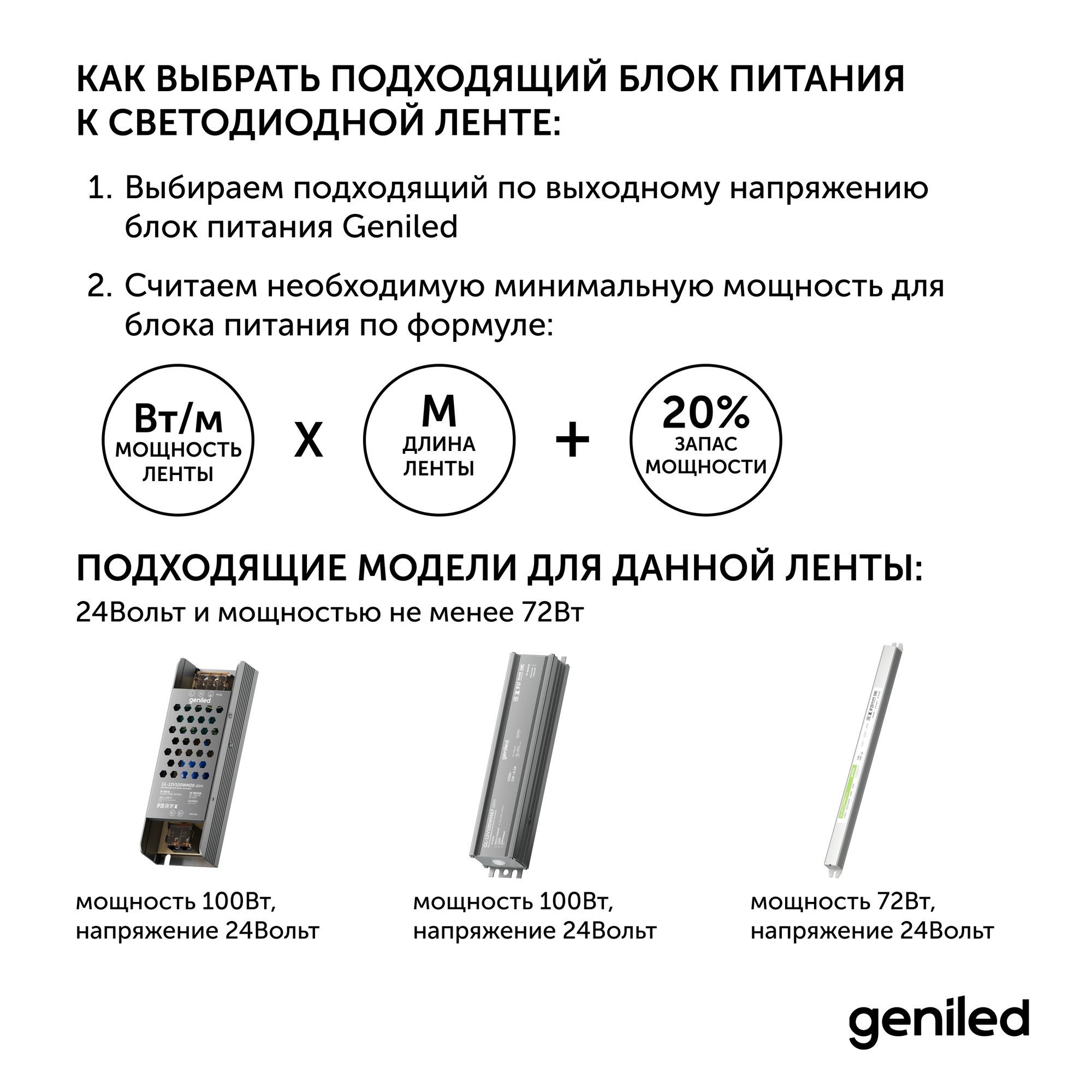 СохранитьСветодиодная лента, подсветка Geniled - для комнаты, в гардероб, на кухню - Белый Нейтральный свет / GL-120SMD2835 / 1080 Лм/м / 24В / Длина - 5м / B - 8 мм / W - 12Вт / 4200 К / IP33 интересное: