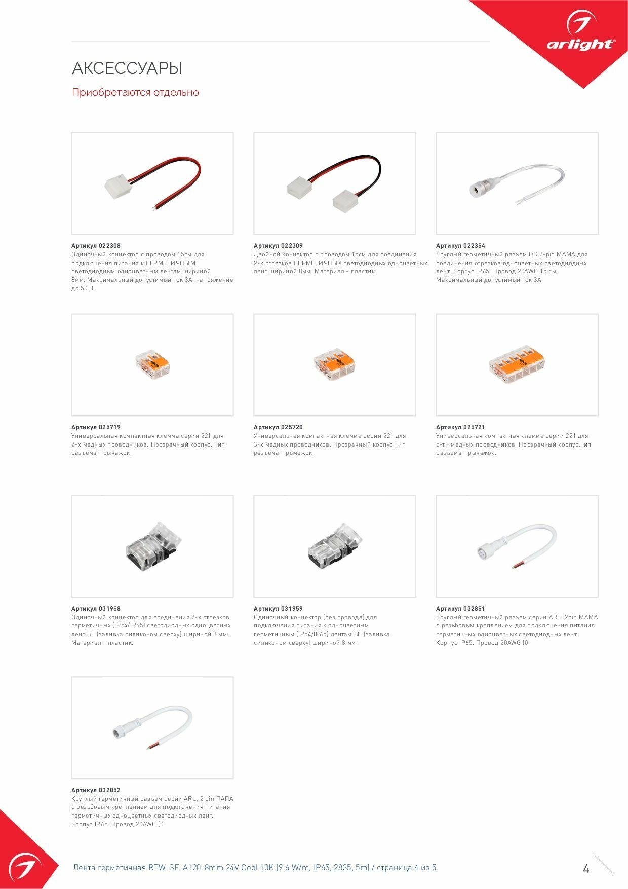 016832(2) Лента герметичная RTW-SE-A120-8mm 24V Cool 10K (9.6 W/m, IP65, 2835, 5m) (Arlight, 9.6 Вт/м, IP65)