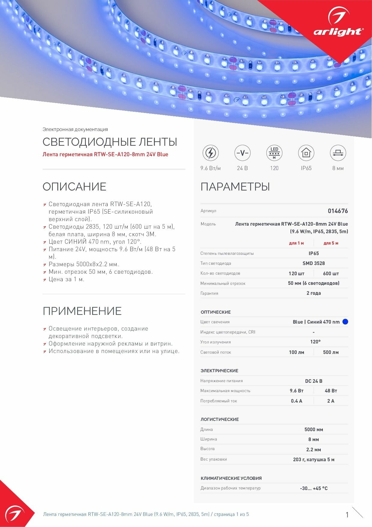 Купить 014676(2) Лента герметичная RTW-SE-A120-8mm 24V Blue (9.6 W/m, IP65, 2835, 5m) (Arlight, 9.6 Вт/м, IP65)
