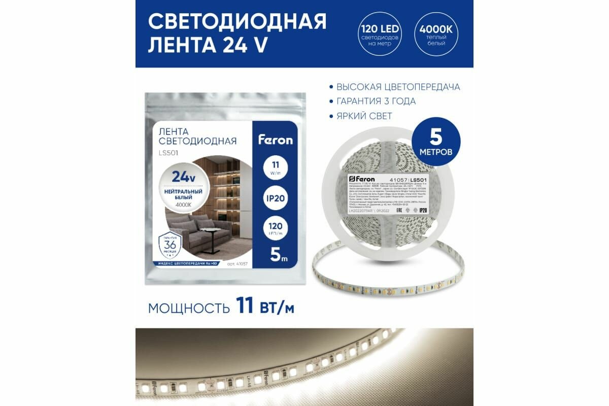 Светодиодная лента Feron 41056 LS501 120SMD(2835)/м 11Вт/м 24V 3000К 5м IP20