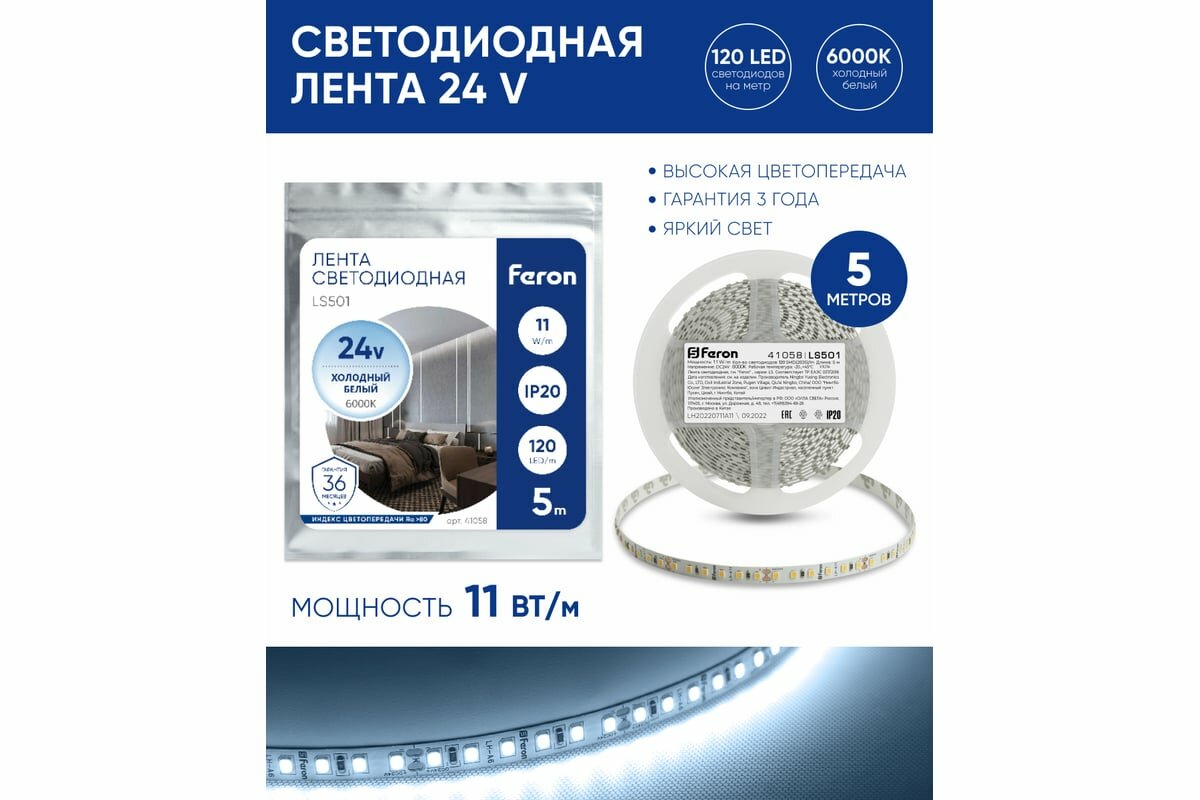 Купить FERON Лента светодиодная 120SMD /м 11Вт/м 24V 5000х8х1.22мм 6000К, LS501 41058
