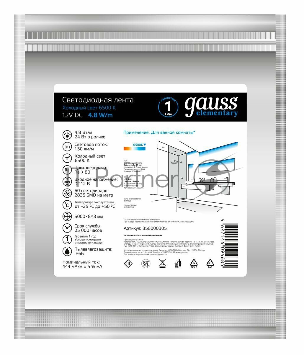 Купить Светодиодная лента 2835/60 12V 4.8W 6500K 8mm IP66 5m Gauss Elementary