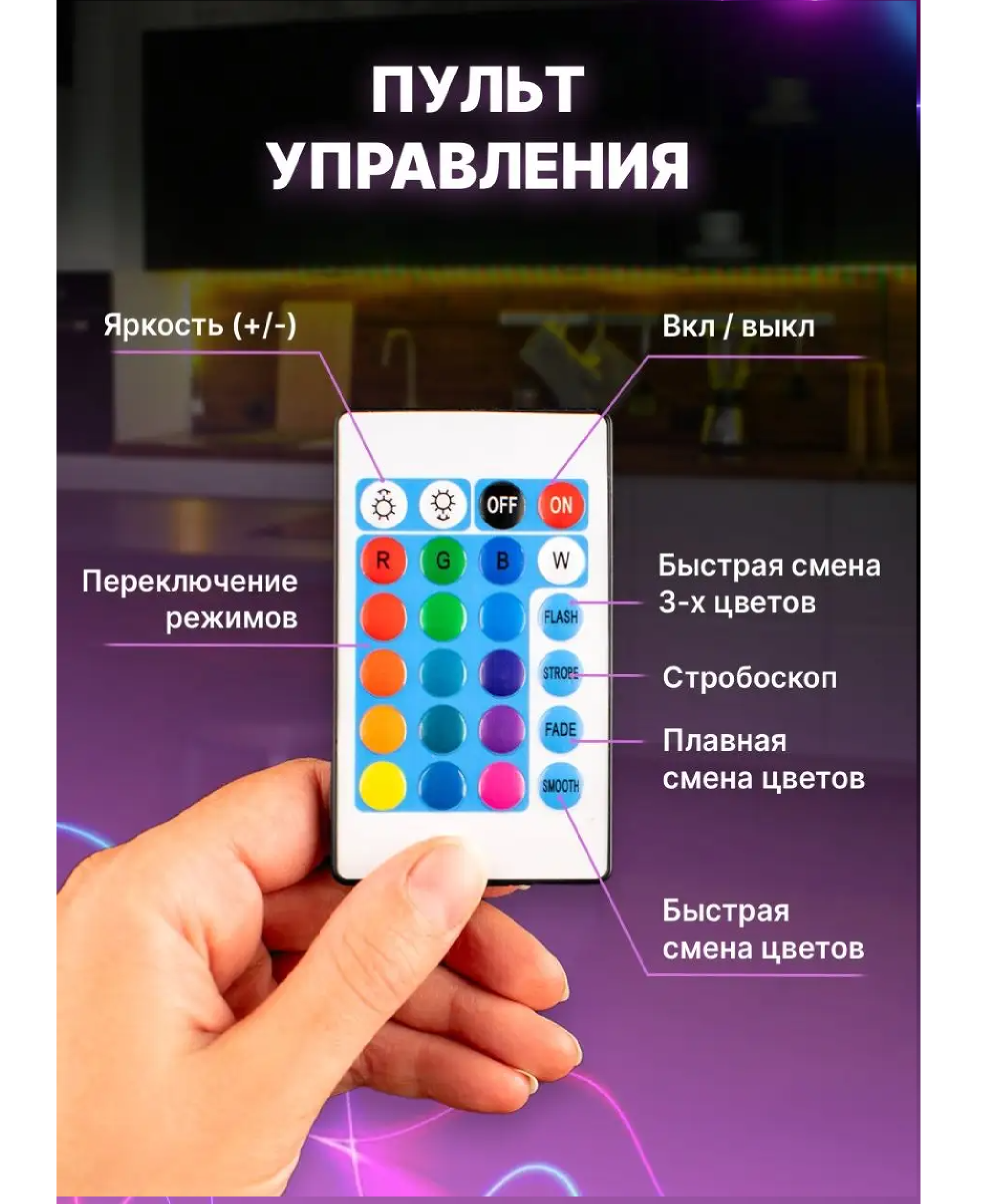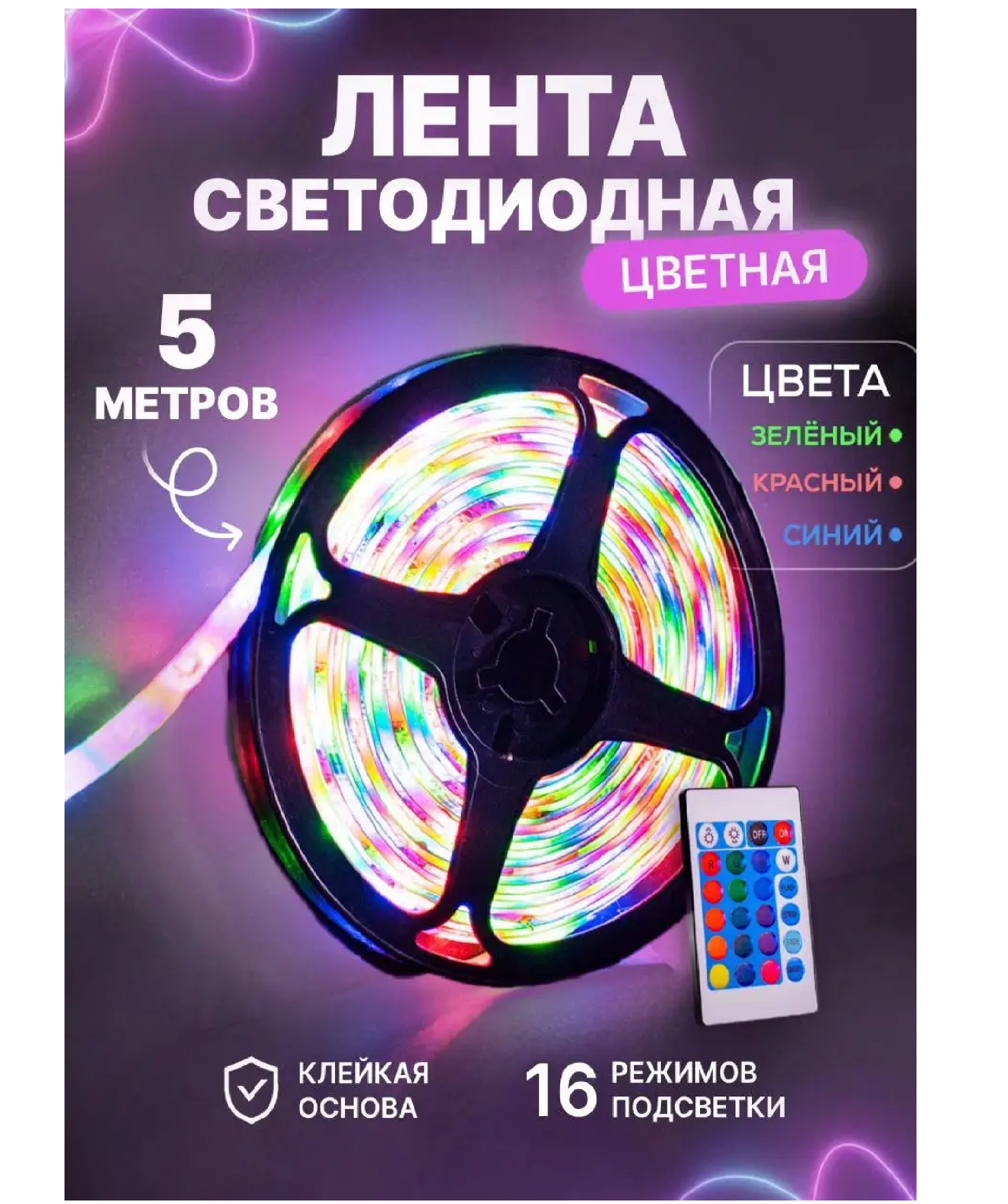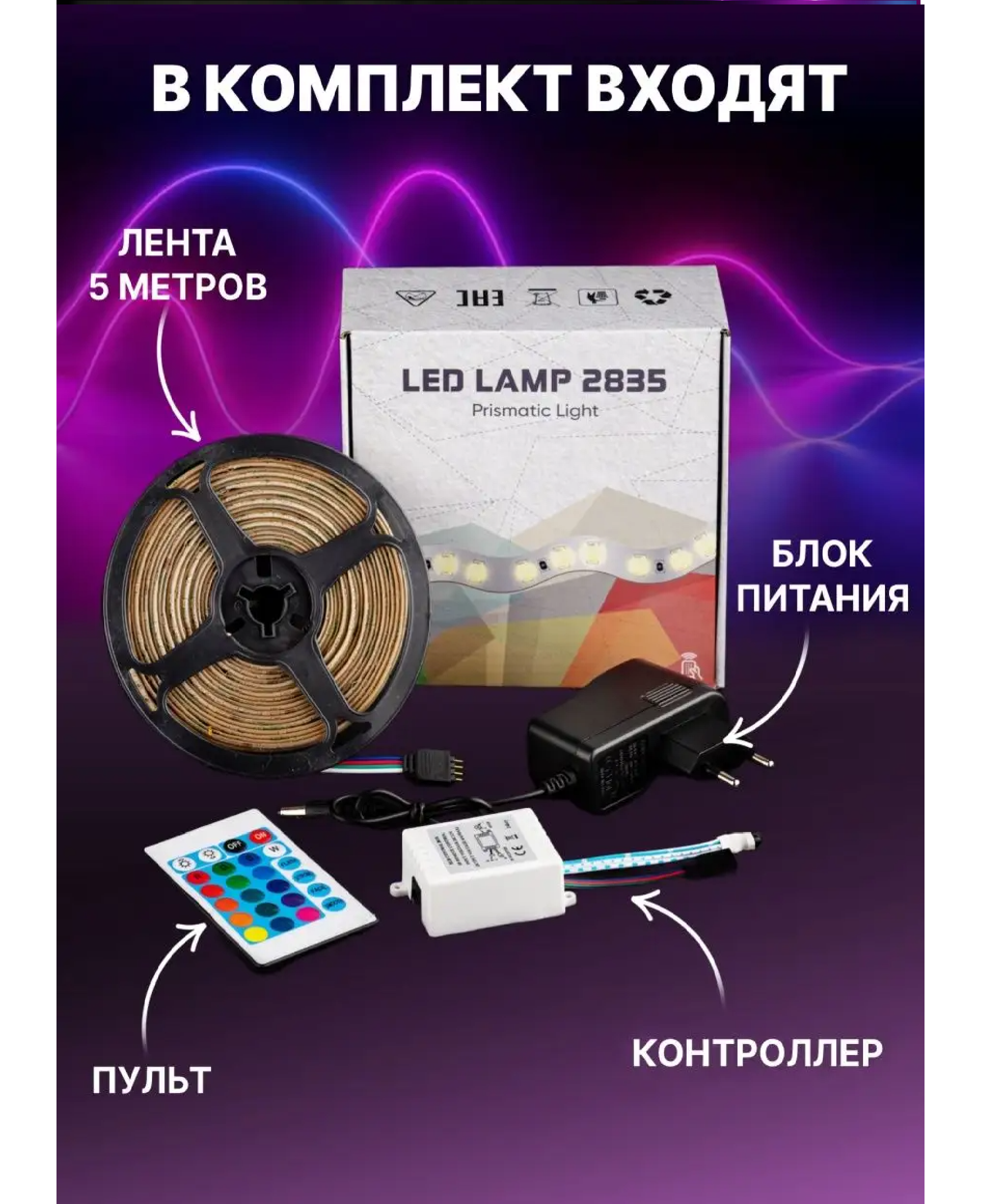 | Комплектация | Упаковка, Светодиодная лента, пульт, блок питания |