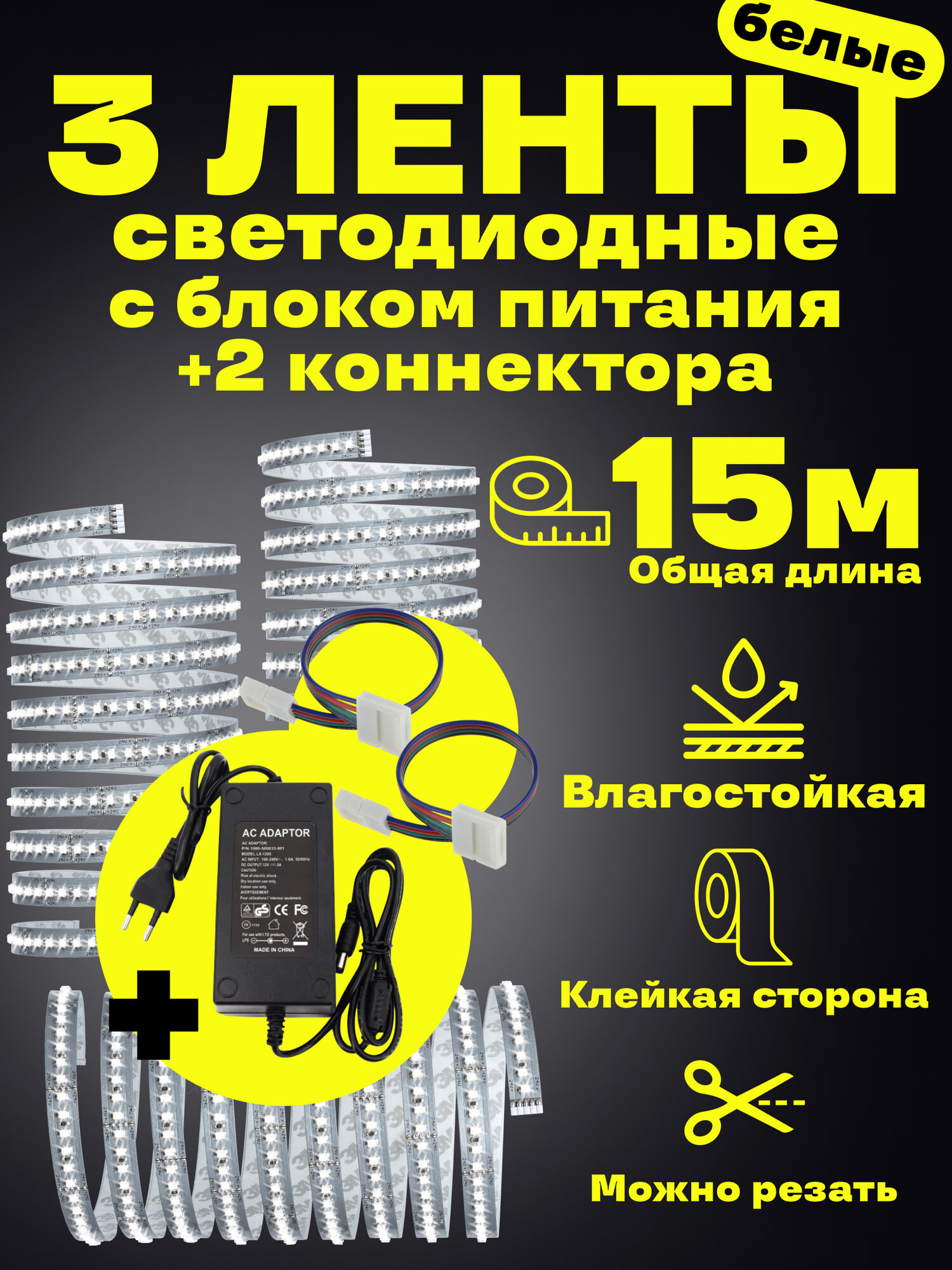 | Комплектация | Светодиодная белая лента 3шт*5м, с блоком питания и двумя коннекторами |