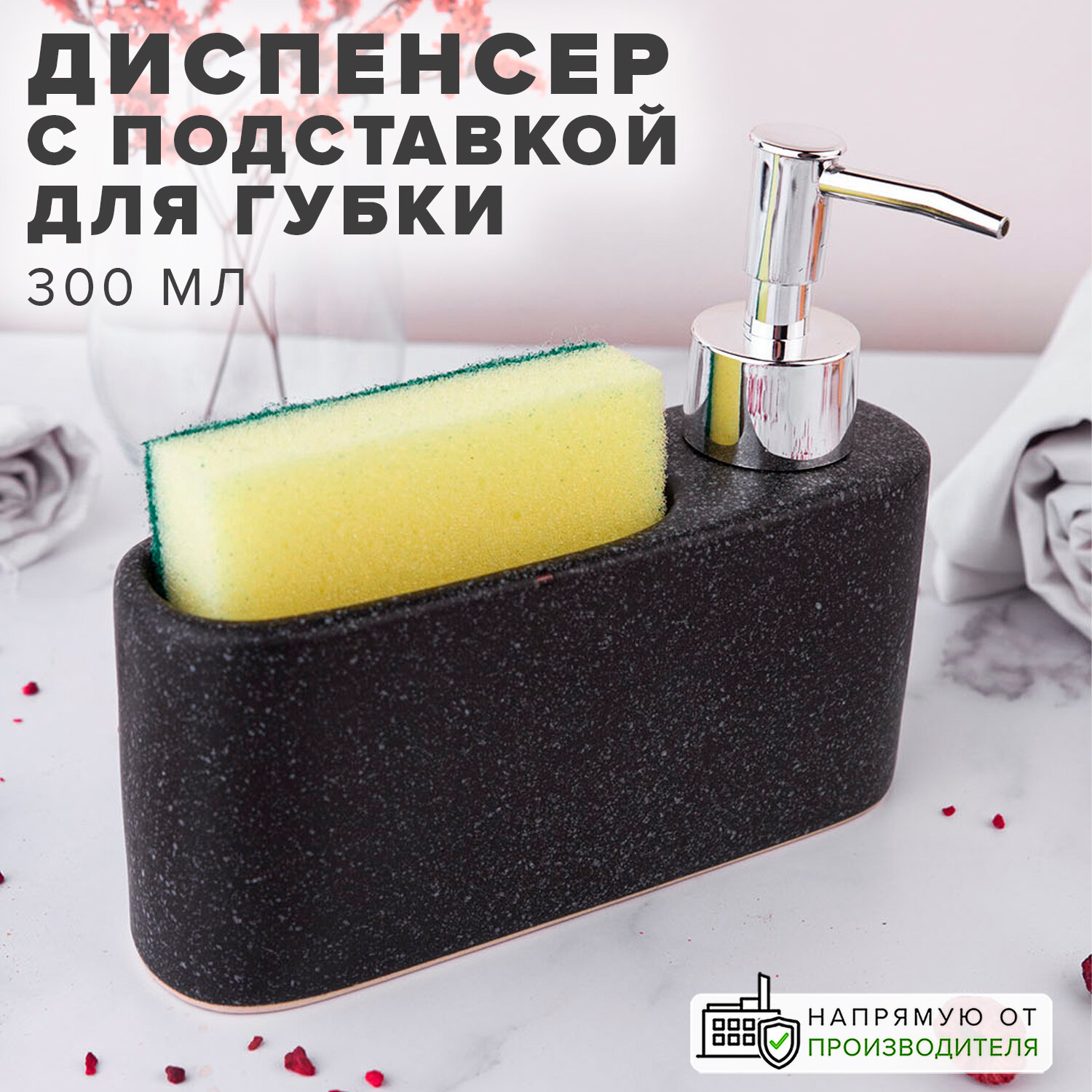 Диспенсер для моющего средства с подставкой для губки кухонный, черный Good Sale интересное: