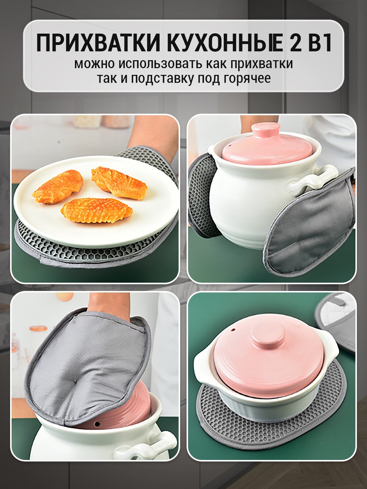 Прихватки для горячего силиконовые кухонные 2 в 1 термостойкие серые, в наборе 2 шт интересное: