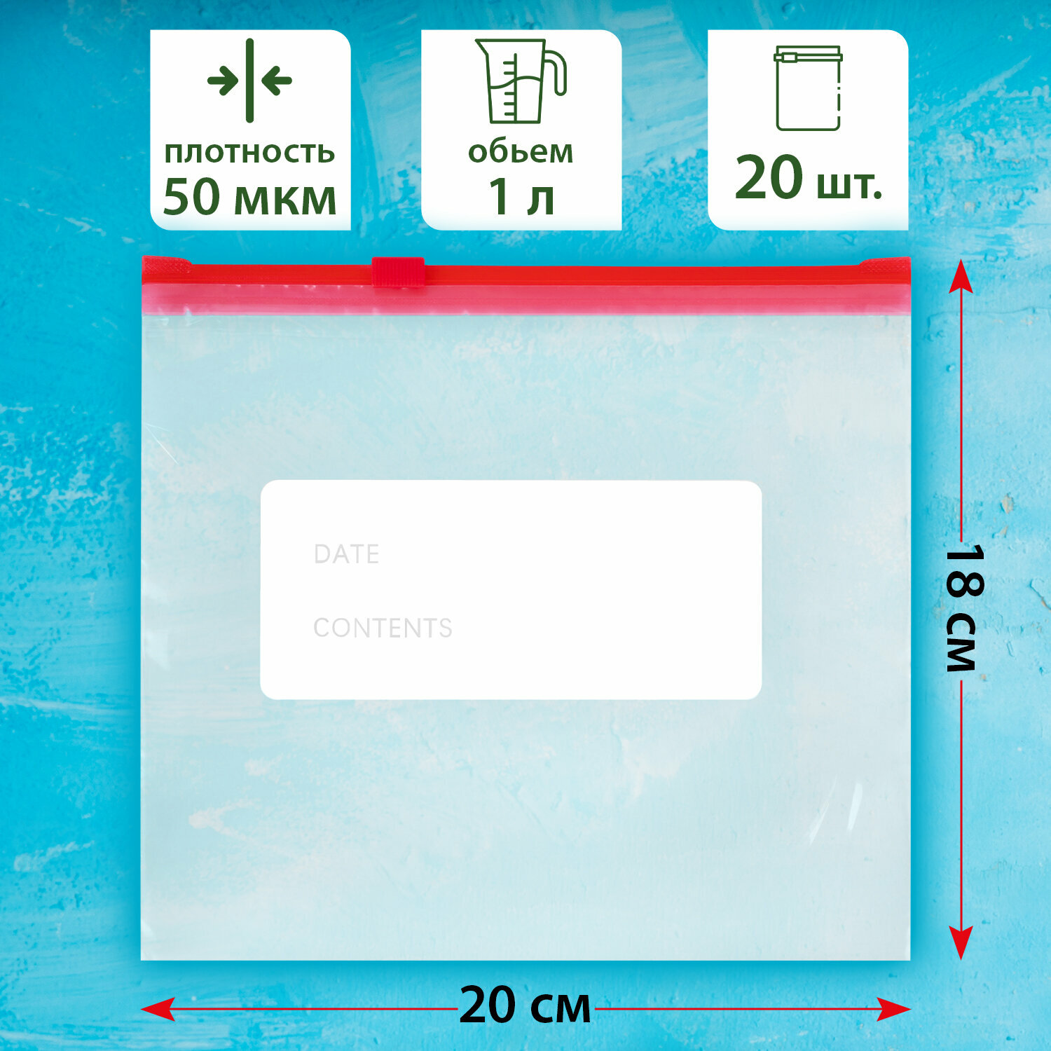 Пакеты для заморозки продуктов, 1 л, комплект 20 шт, с замком-застежкой (слайдер), LAIMA
