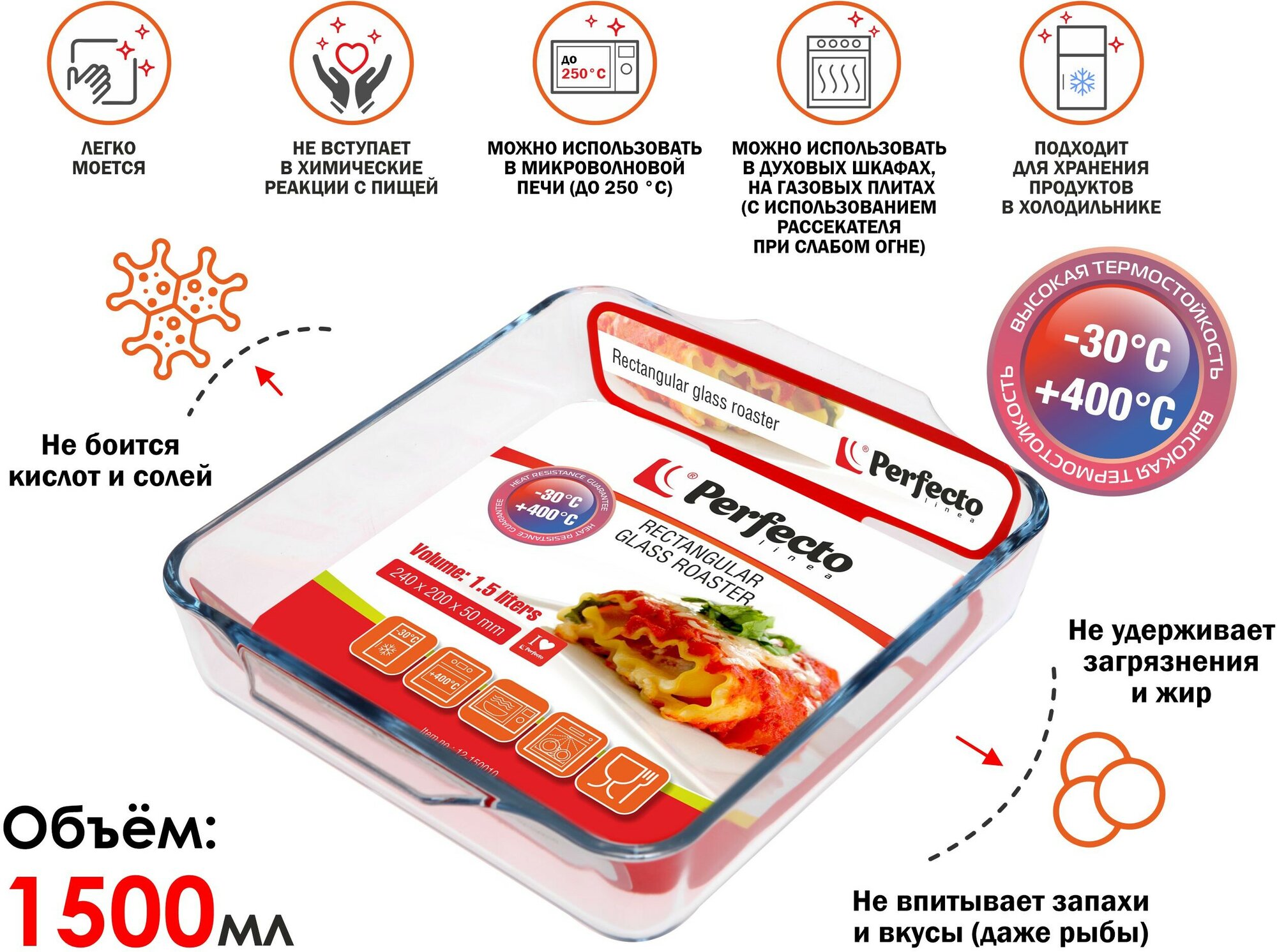 Форма из жаропрочного стекла, 1.5 л, прямоугольная, 240х200х50 мм, PERFECTO LINEA (12-150010)