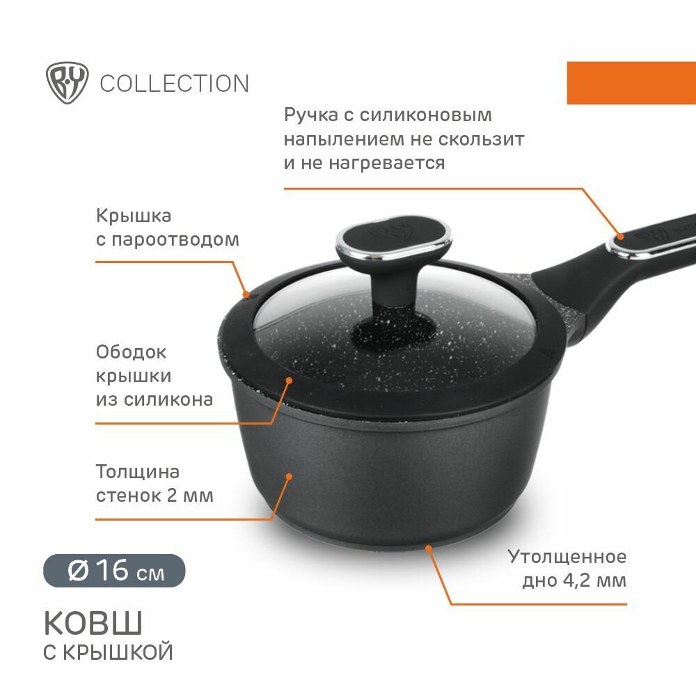 Ковш кухонный 1,4 л с крышкой, антипригарное покрытие мрамор, индукция BY COLLECTION