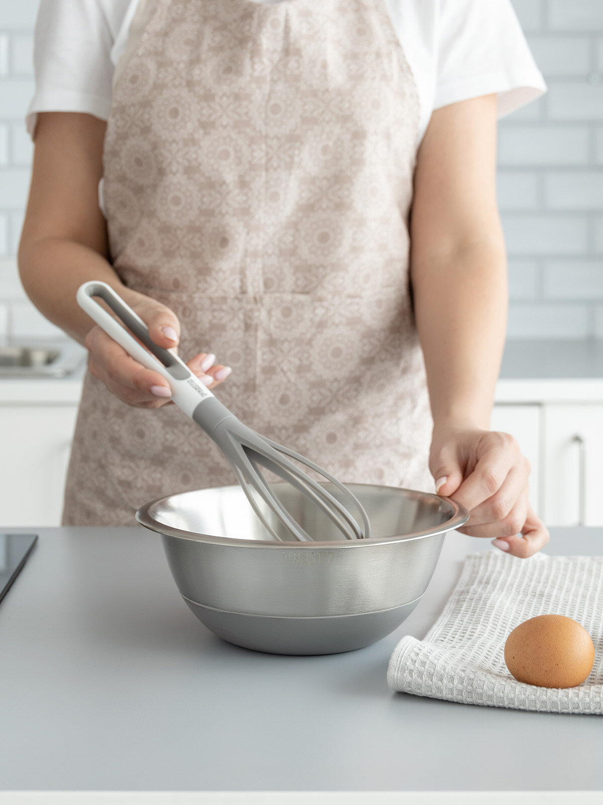 Миска для смешивания продуктов DeNASTIA D22см, 1,9л, нерж. сталь+силикон, бежевая