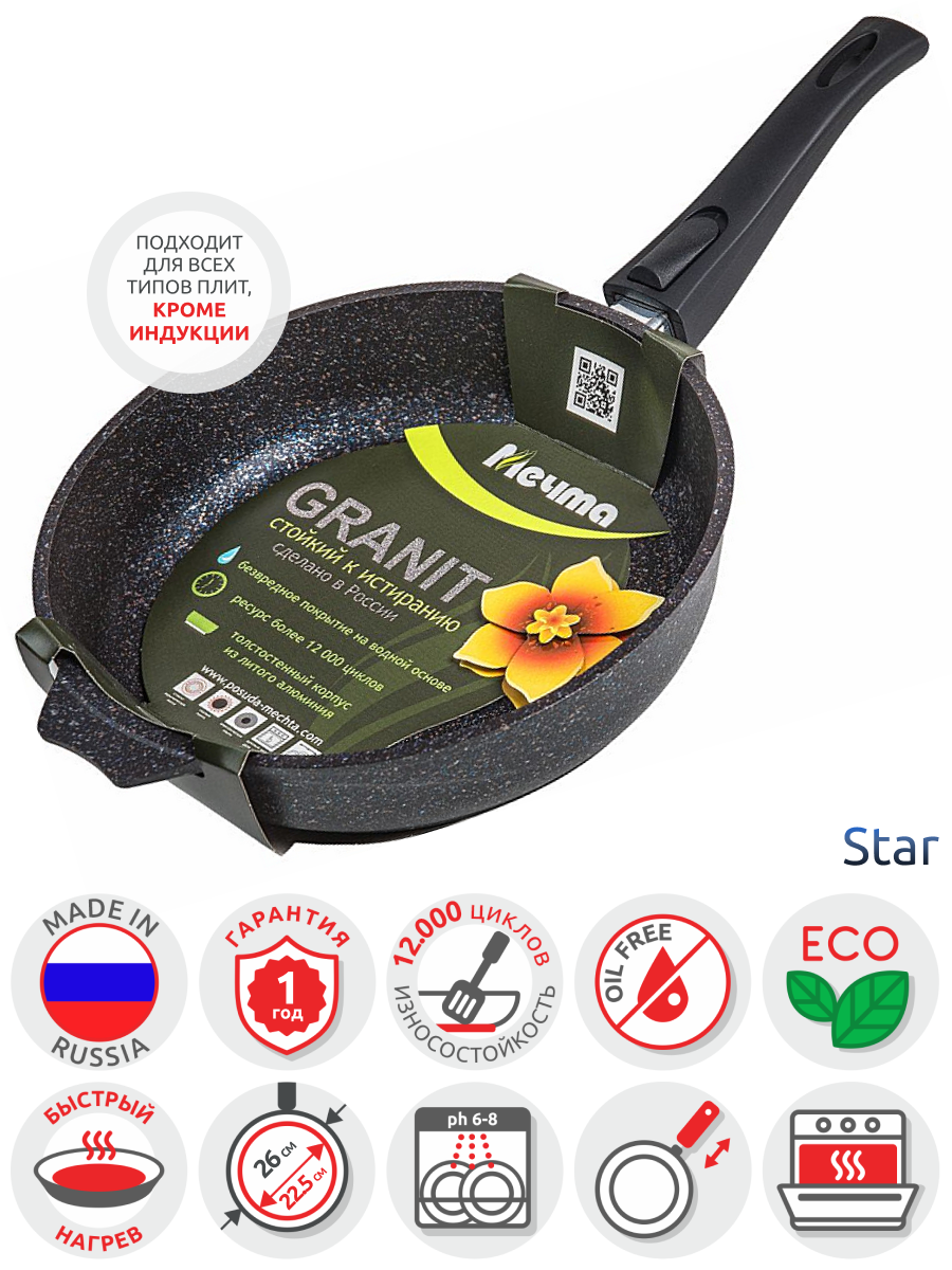 Набор посуды (сковорода 26 см, кастрюля 5 л, ковш 1,7 л, 2 съемных ручки, 2 крышки), мечта "Гранит Black", 001802, 700722