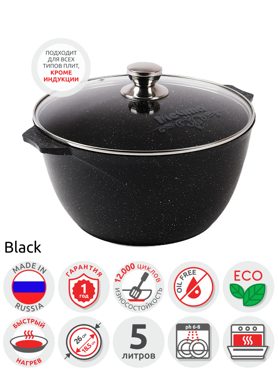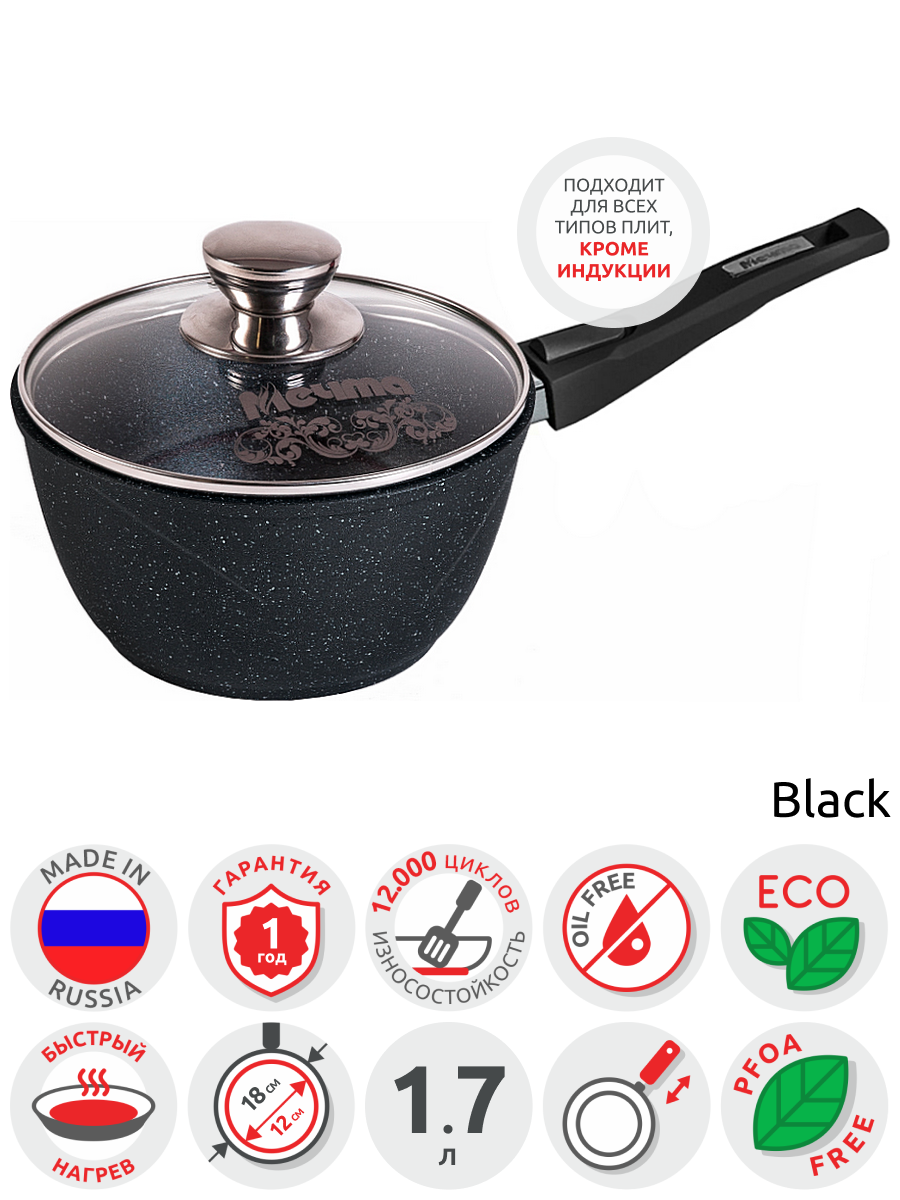 Набор посуды (сковорода 26 см, кастрюля 5 л, ковш 1,7 л, 2 съемных ручки, 2 крышки), мечта "Гранит Black", 001802, 700722