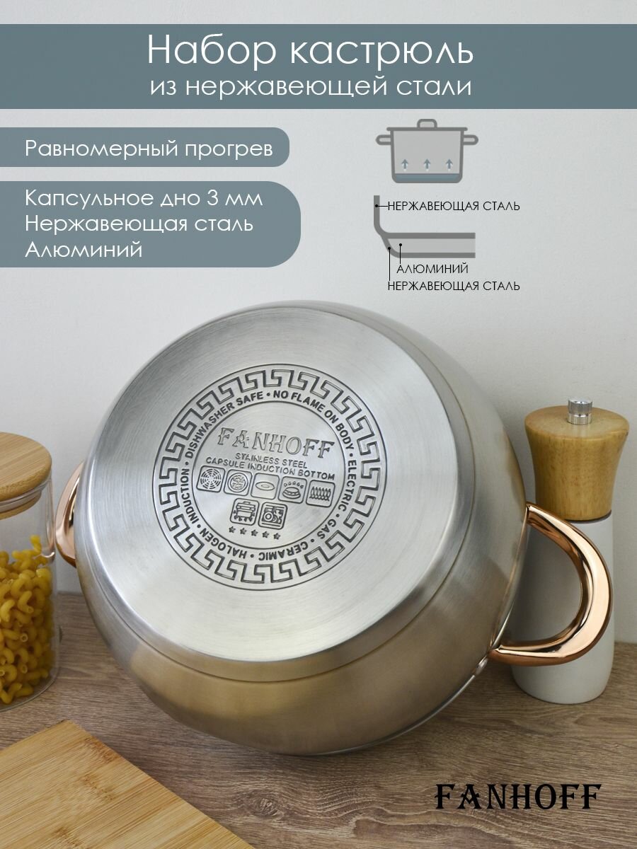 Набор кастрюль FANHOFF из нержавеющей стали с крышками, 6,3 л, 2,8 л, 2 л