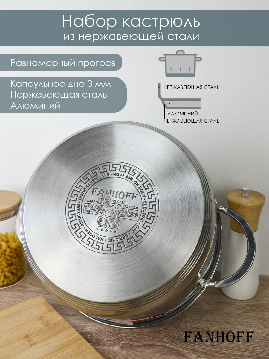 Набор кастрюль FANHOFF из нержавеющей стали с крышками, 6,7 л, 4 л, 3 л