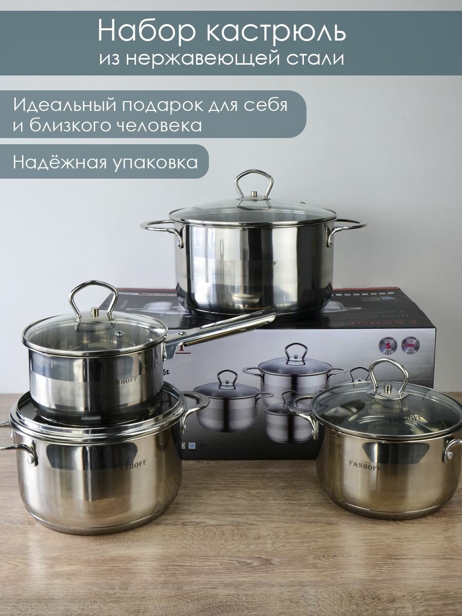 Купить Набор посуды FANHOFF из нержавеющей стали с крышками, 8 предметов