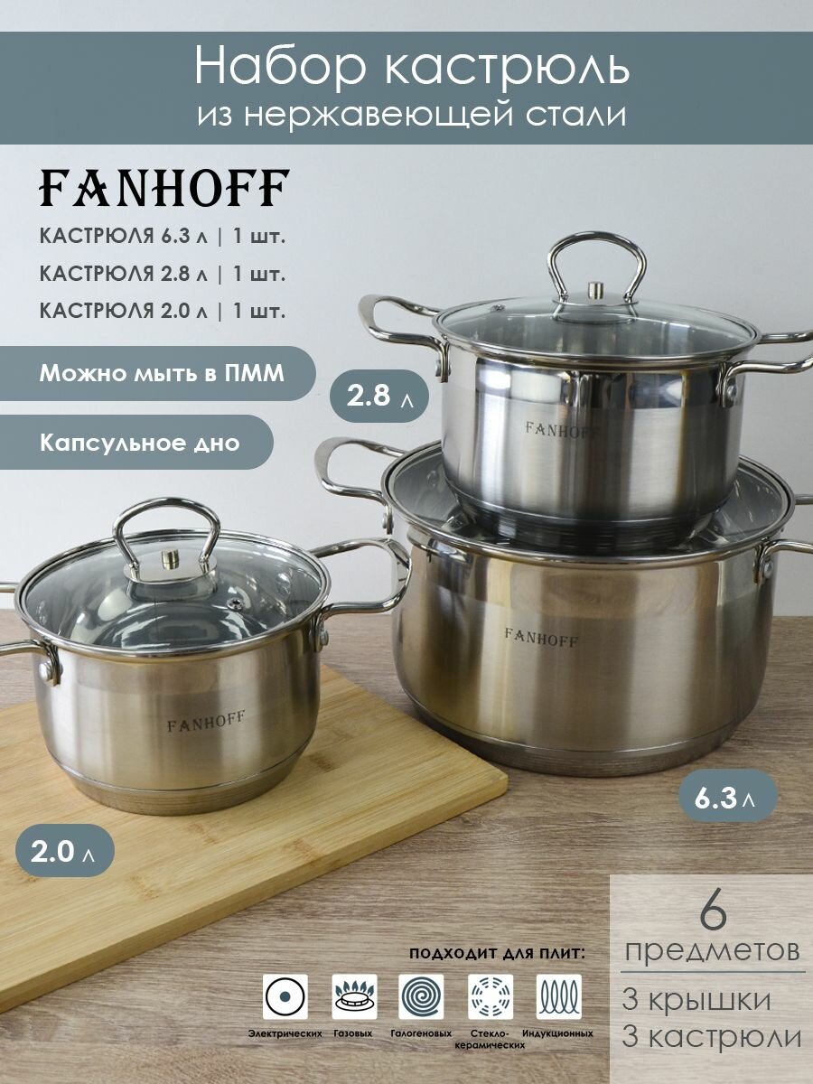 Купить Набор кастрюль FANHOFF из нержавеющей стали с крышками, 6,3 л, 2,8 л, 2 л