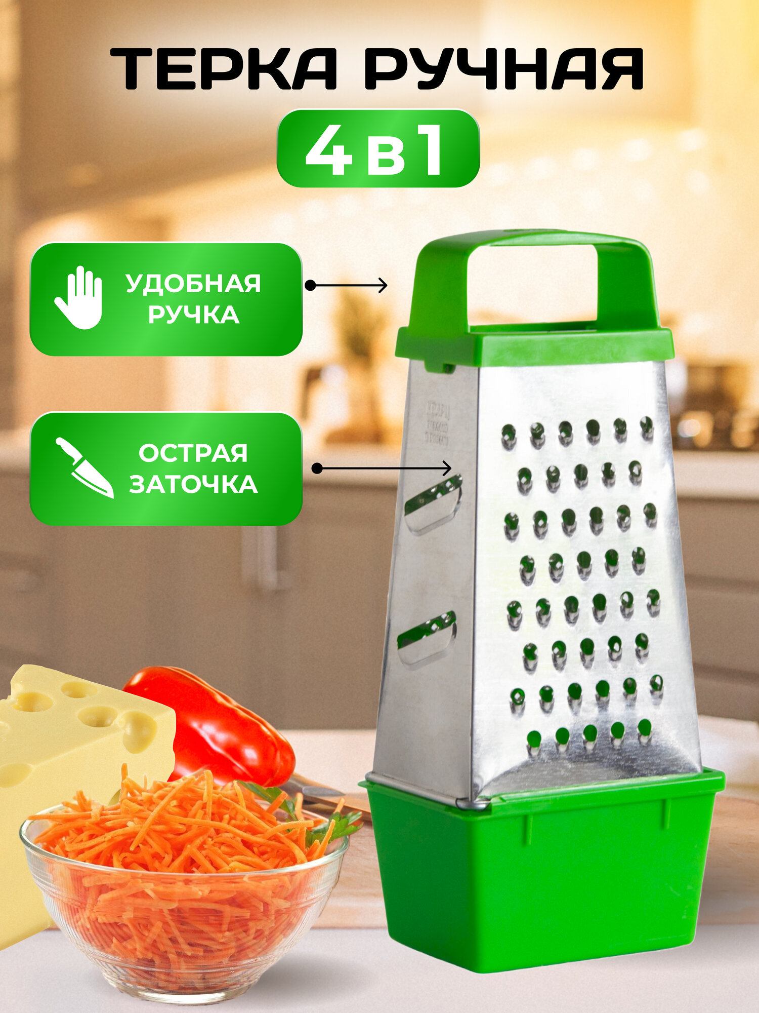 Терка с контейнером ручная, 4 в 1 зеленая интересное: