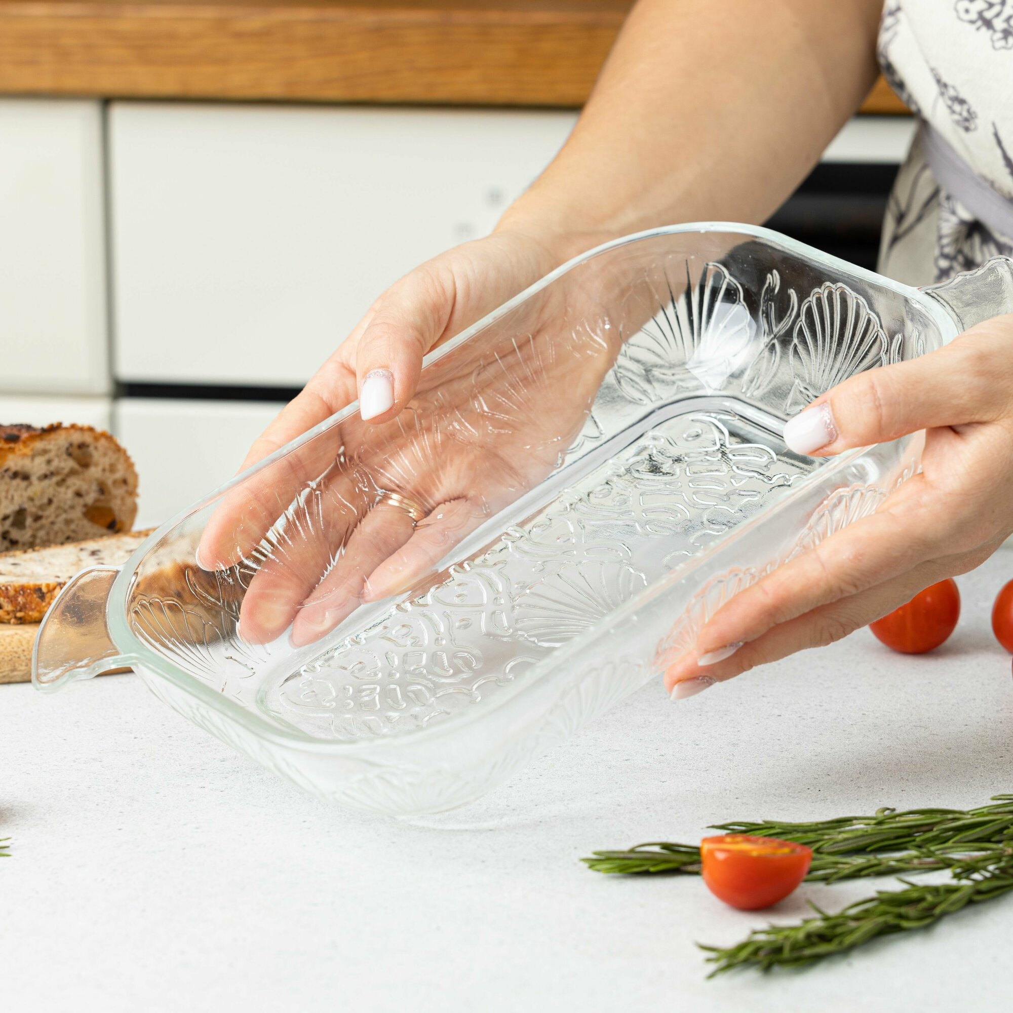 Салатник стеклянный, шубница, блюдо сервировочное для холодца, мимозы "Рельефная феерия". Объём 1200 мл. Размер без ручек: 240 мм*155мм*50мм.