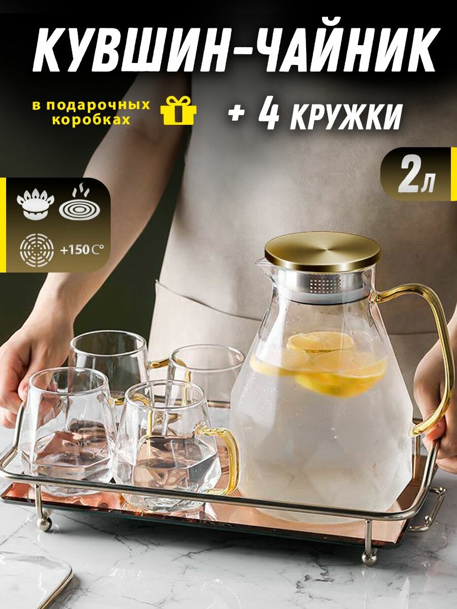 Кувшин стеклянный + 4 кружки (для воды и напитков жаропрочные из боросиликатного стекла), Шампань, ADECORI