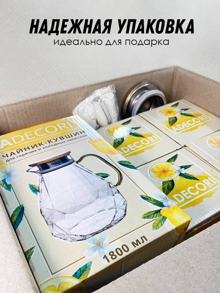 Кувшин для воды для напитков с фильтр-крышкой/ графин для воды/ чайник стеклянный жаропрочный из боросиликатного стекла в подарочной упаковке, Элен, 1800 мл, ADECORI