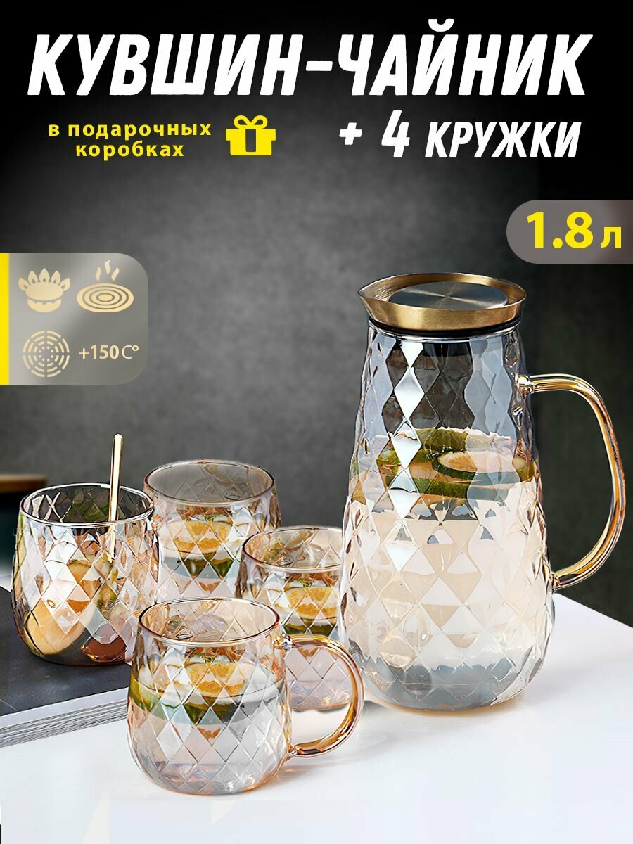 Кувшин стеклянный + 4 кружки (для воды и напитков жаропрочные из боросиликатного стекла), Шампань, ADECORI