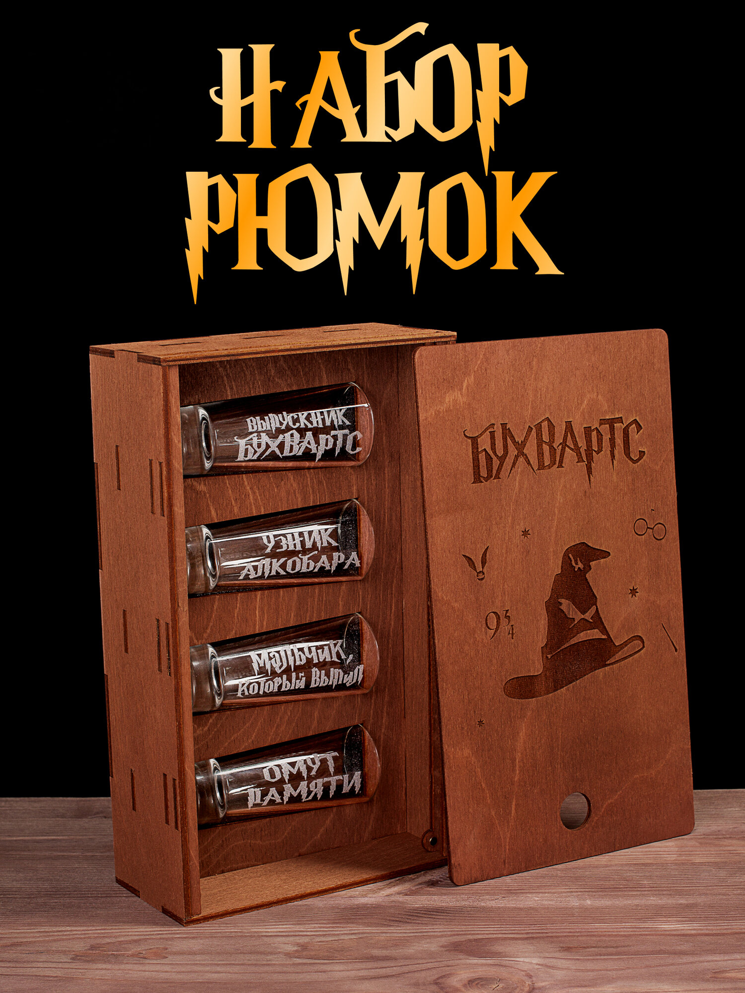 Купить 4 Стопки в подарок в деревянной коробке, набор стопок с гравировкой Хогвартс