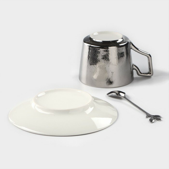 Купить Кофейная пара керамическая «Серебро», 3 предмета: чашка 200 мл, блюдце d=14 см, ложка h=12,5 см, цвет серебряный