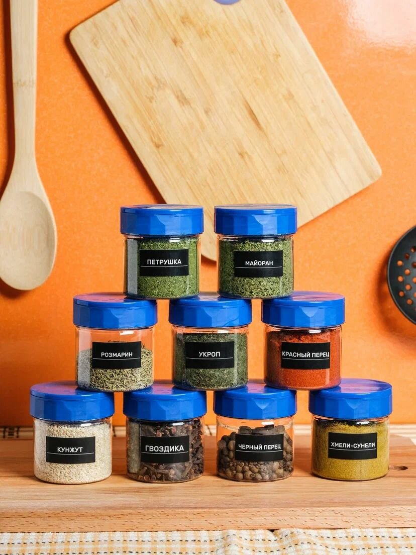 Баночки для сыпучих специй 150 мл 9 штук, наклейки и крышки в комплекте