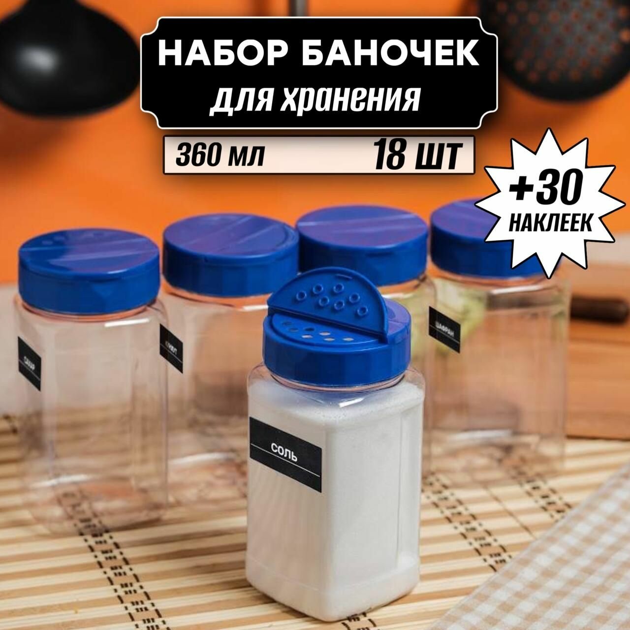 Баночки для специй и приправ 360 мл 18 шт, наклейки и крышки с дозатором в комплекте