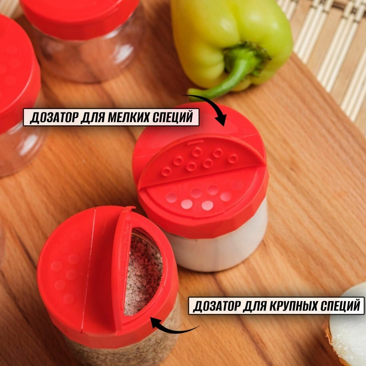Баночка для специй и приправ с наклейками 360 мл 6 шт, ( красные крышки с дозатором в комплекте )