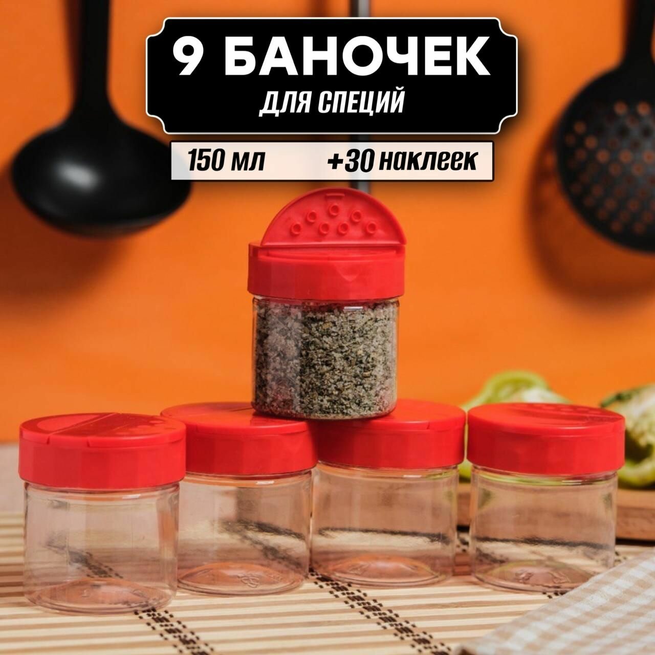 Баночки для сыпучих специй 150 мл 9 штук, наклейки и крышки в комплекте