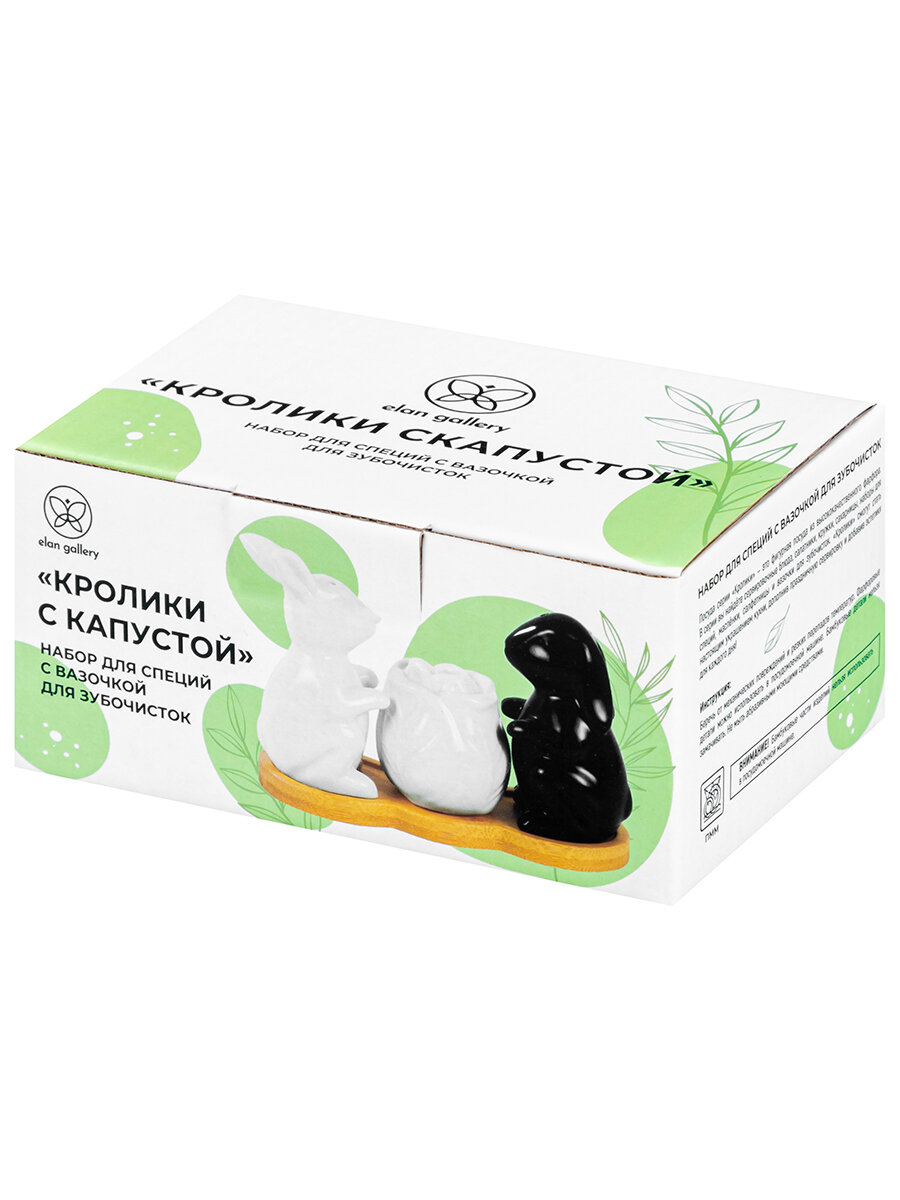 | Дополнительная информация | Набор для специй "Кролики с капустой" 3 предмета, бело-черный, солонка 5х4,5х9 см 45 мл, перечница 4,8х4,8х8 см 45 мл, вазочка для зубочисток 5,2х5,2х5,2 см 50 мл, на деревянной подставке 14х6х1 см, с зубочистками в комплекте |