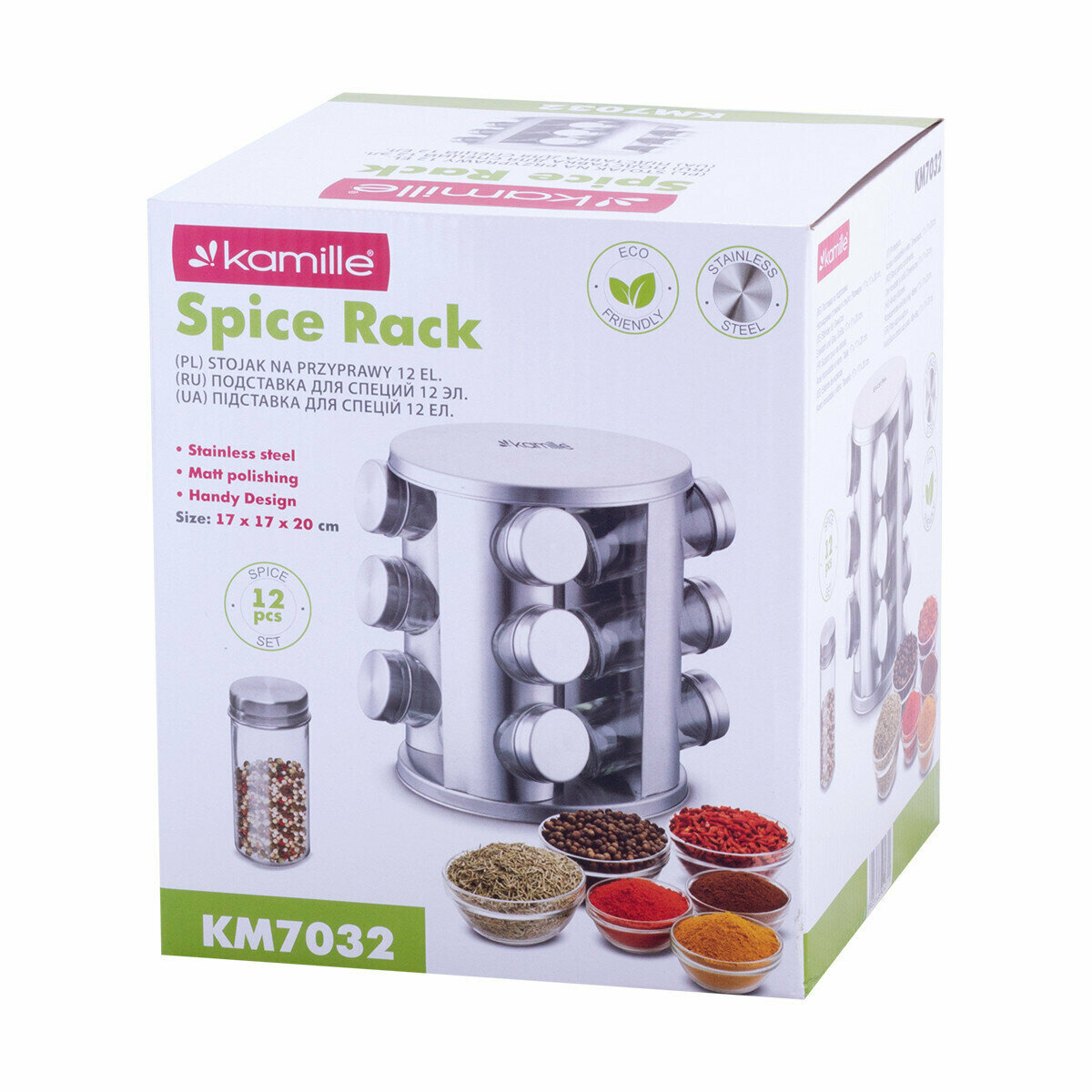Купить Набор ёмкостей для специй Kamille КМ-7032 (12 шт.) на круглой подставке из нержавеющей стали