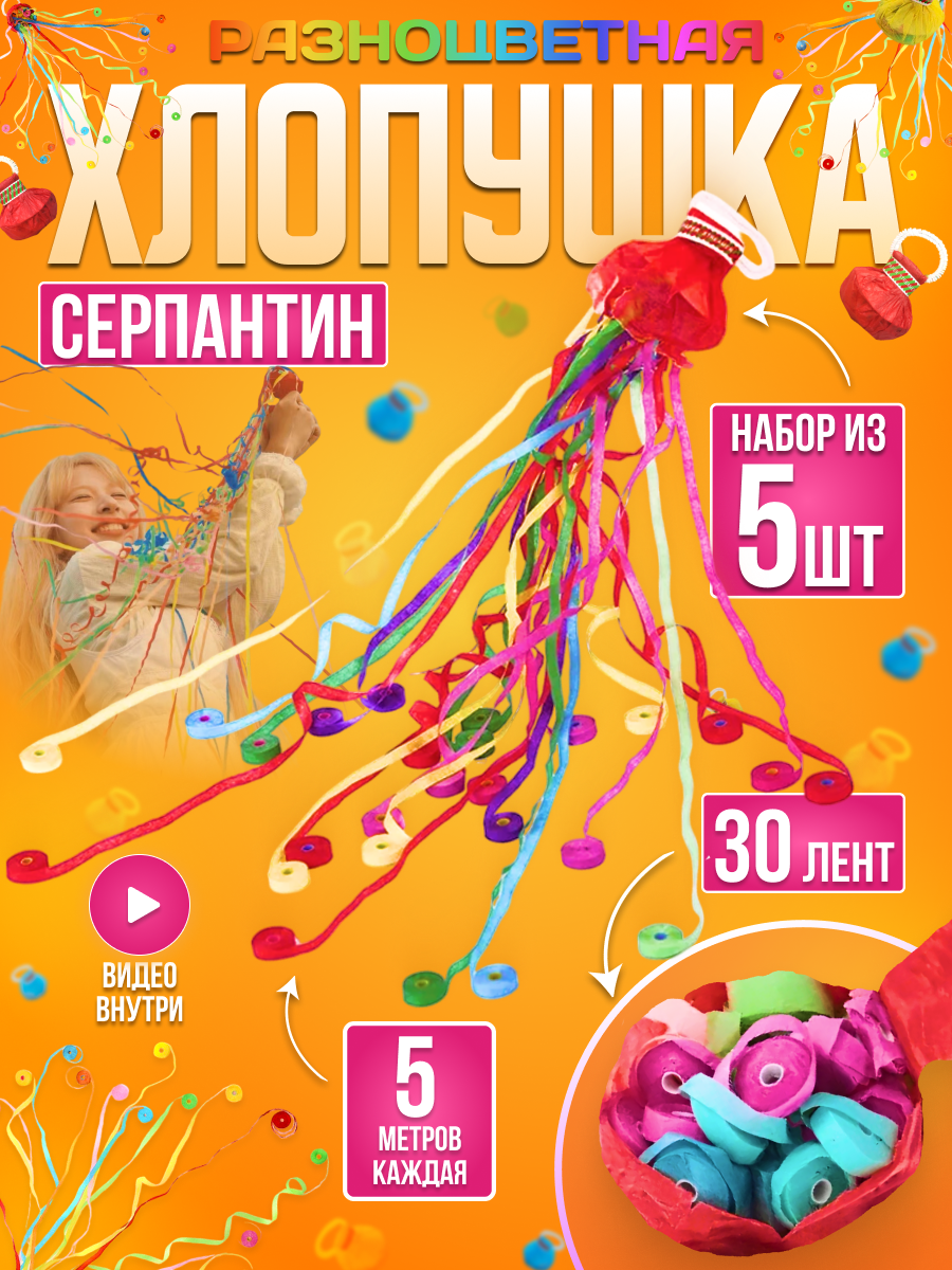 Хлопушка для праздника с серпантином - набор 5 шт. интересное: