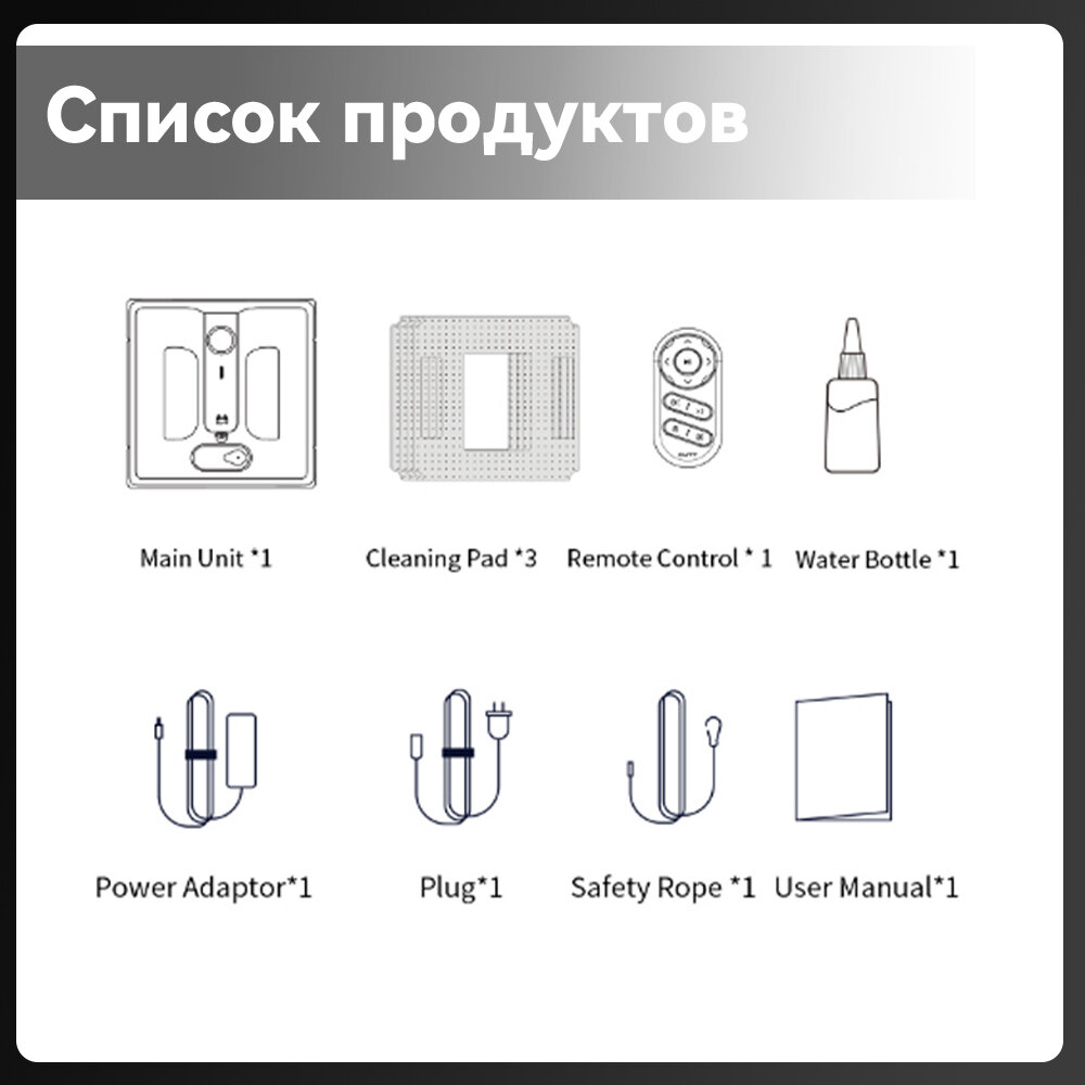 | В комплекте | адаптер питания, зарядное устройство, моющая тряпка, пульт ДУ, страховочный шнур |