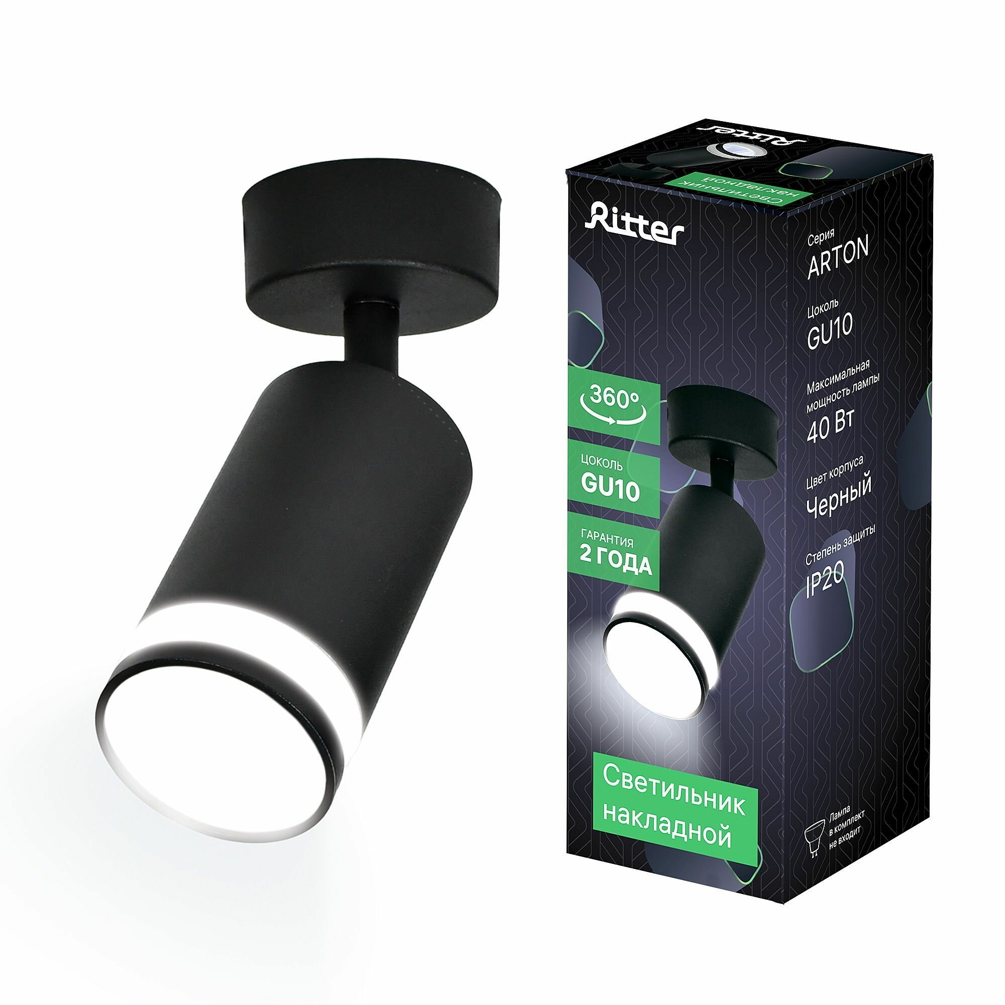 Накладной светильник Ritter , Arton, поворотный, цилиндр, 260x55x160мм, 2хGU10, алюминий, черный, 59934 0,