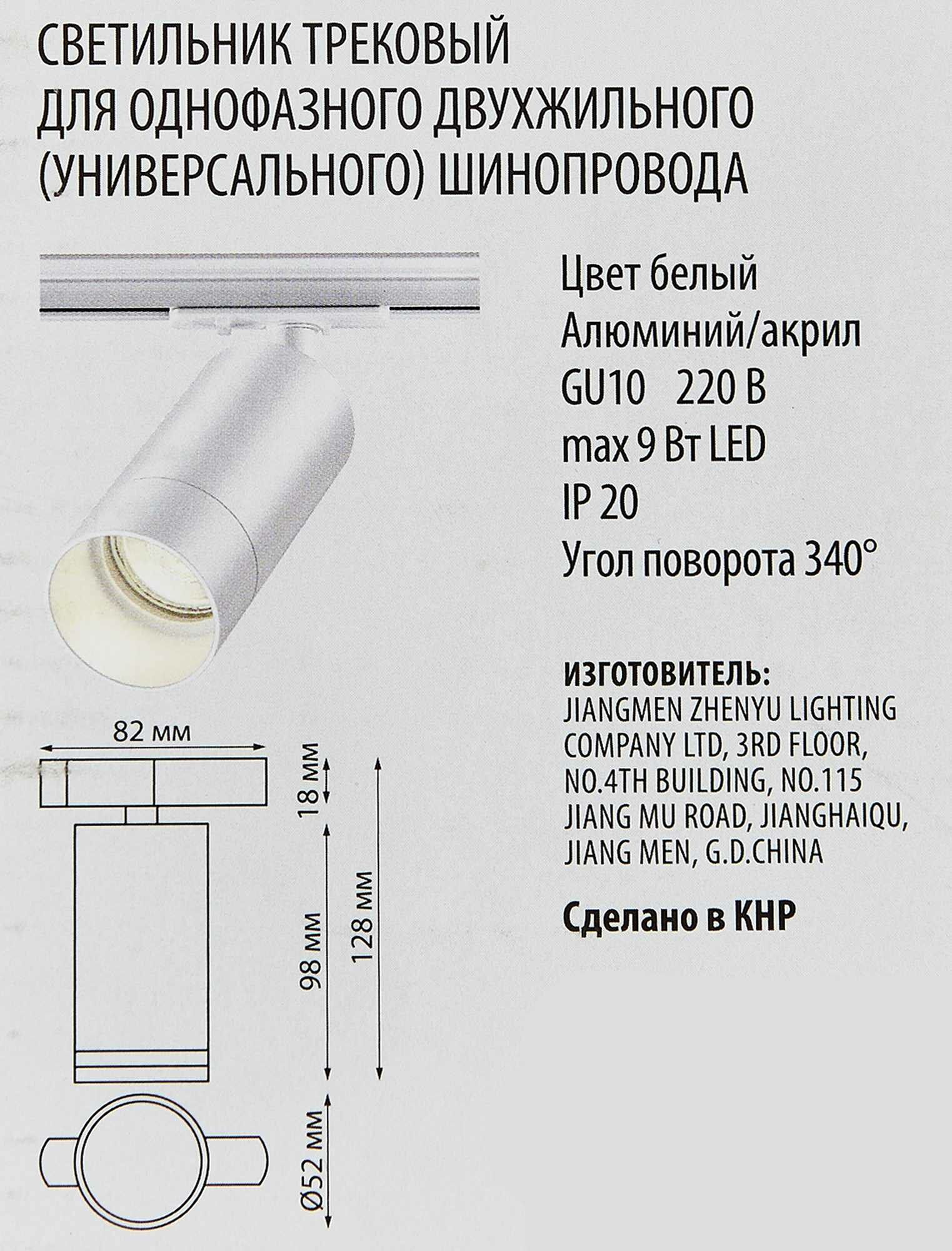 Трековый светильник Novotech 370849 на однофазную токовую шину(2 медных жилы)