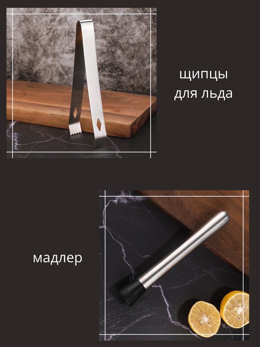 | Подробная комплектация | шейкер 750мл, мадлер, ложка с пяткой, открывалка, джиггер, щипцы, 2 гейзера |