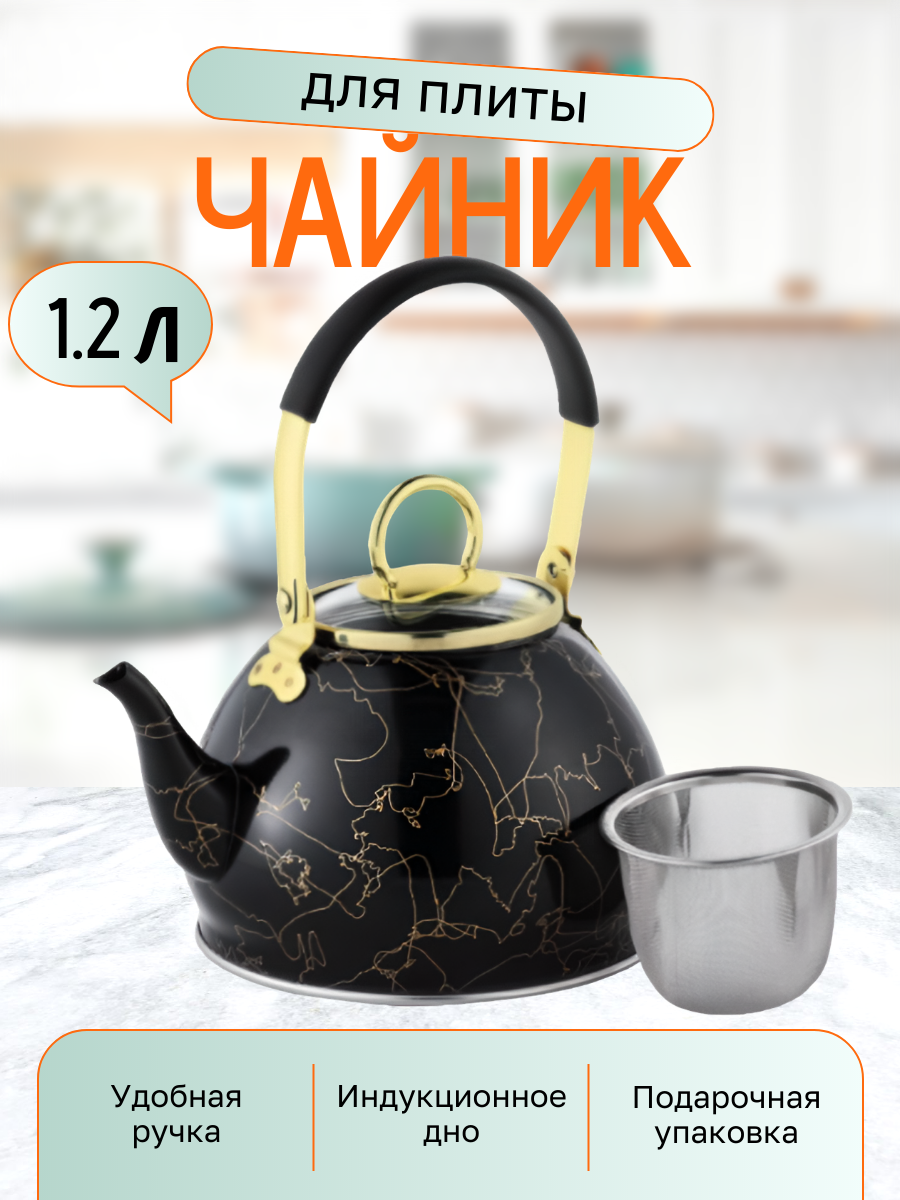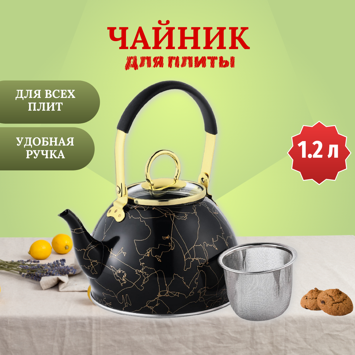 Купить Металлический чайник Kelli для плиты 1,2л с ситечком, черный мрамор