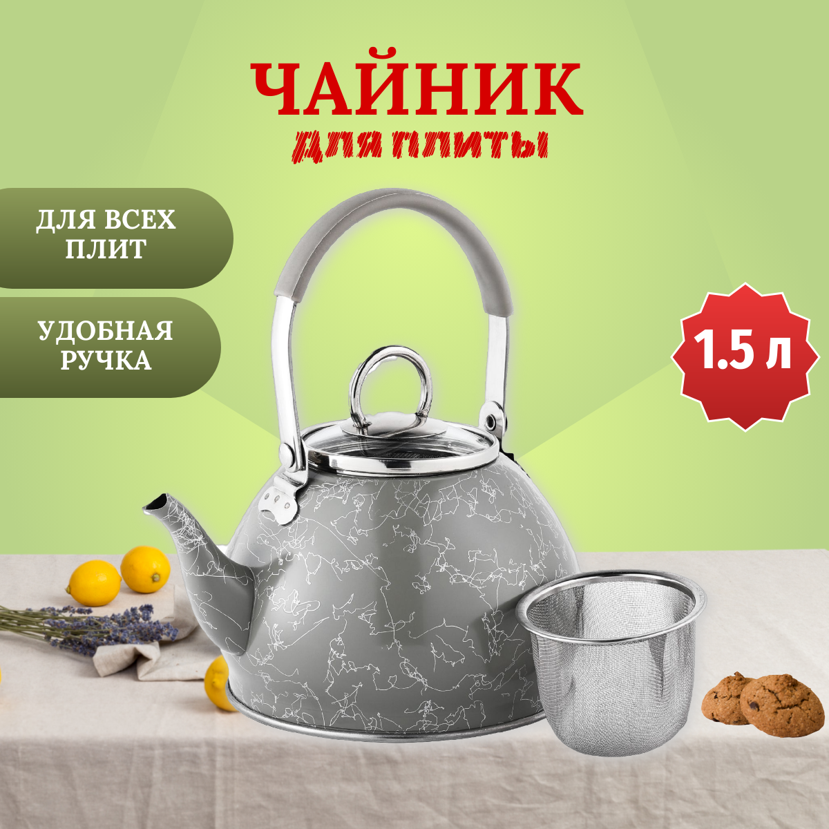 Купить Металлический чайник Kelli для плиты 1,5л с ситечком, серый мрамор