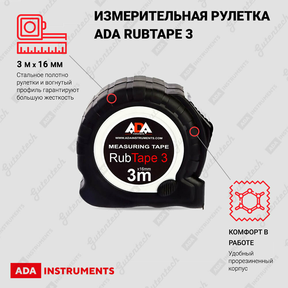 Рулетка ударопрочная ADA RubTape 3 с полимерным покрытием ленты (сталь, с двумя стопами, 3 м) А00155 . интересное: