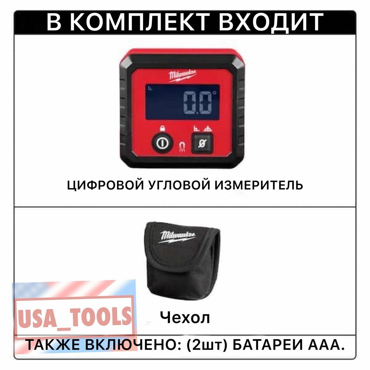 | Подробная комплектация | Цифровой датчик угла и уровень 48-22-5602=1 шт Мягкий чехол =1 шт батарейки ААА=2 шт |