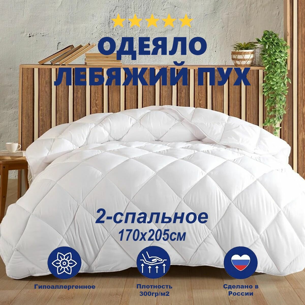 Одеяло лебяжий пух Поплин 170х205 см, двуспальное 300гр/м2 / 100% хлопок / Horeca одеяло для отелей и гостиниц