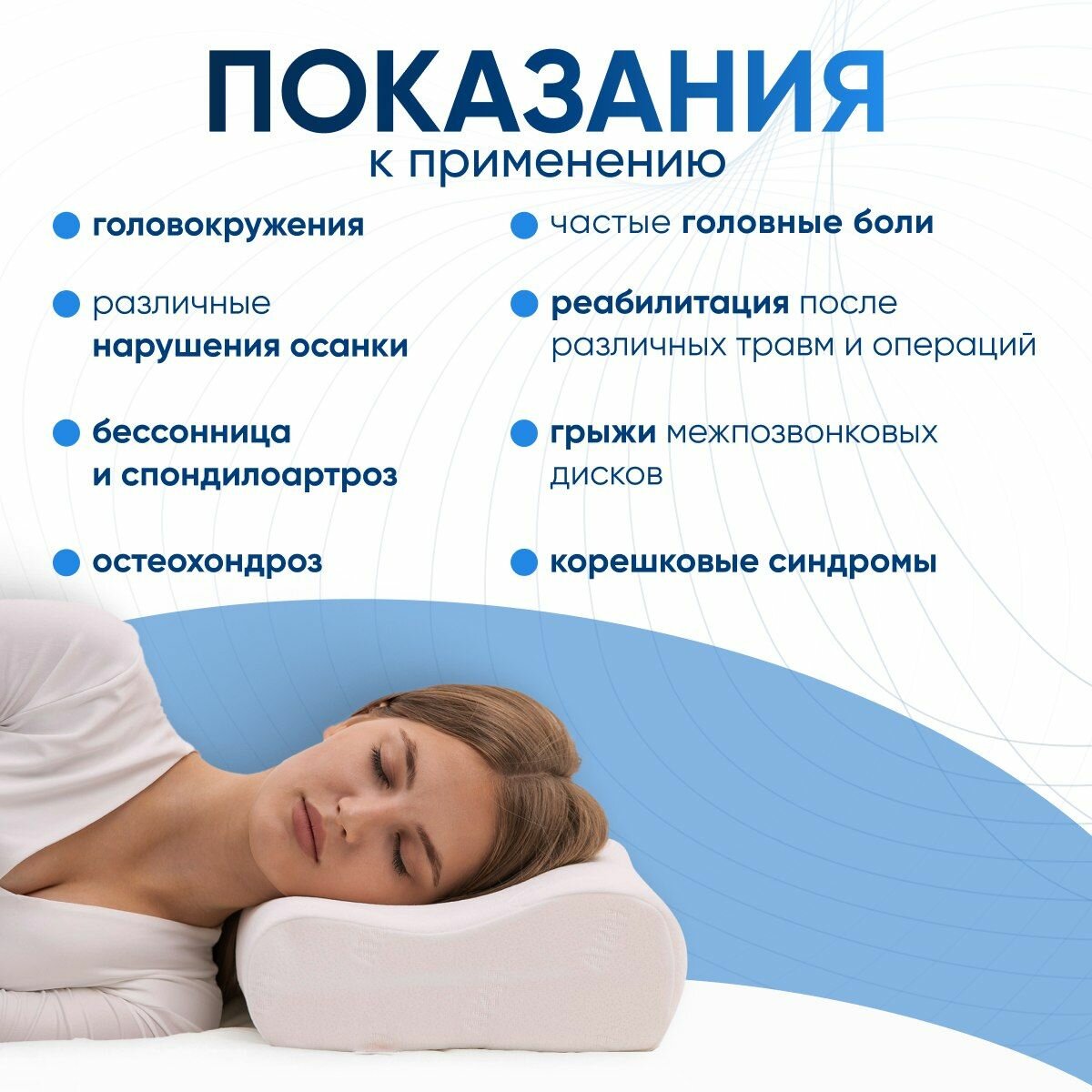 | Дополнительная информация | подушка поддерживает анатомически правильное положение головы и шейного отдела позвоночника, способствует комфортному спокойному сну, наполнитель - медицинский пенополиуретан, материал наполнителя обладает «эффектом памяти», что позволяет подушке точно повторять контуры тела, два валика с различной высотой 12 и 10 см |