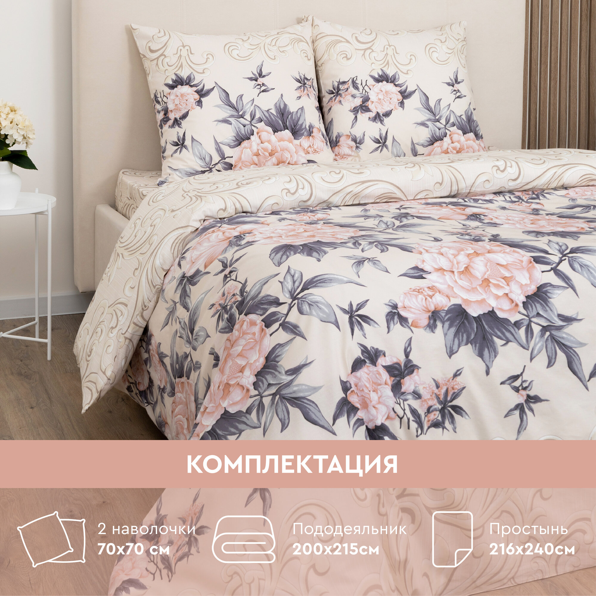 Постельное белье "Василиса" Семейное, Поплин, наволочки 70х70 см, Пионовый шик