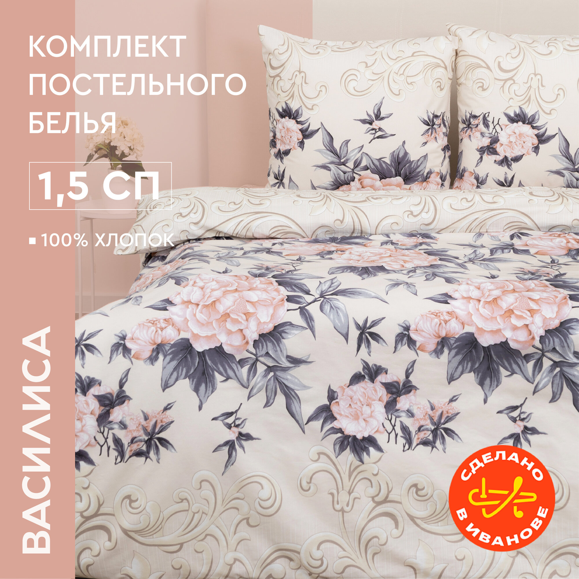 Постельное белье Василиса 1,5 спальное, Поплин, наволочки 70х70 см, Пионовый шик